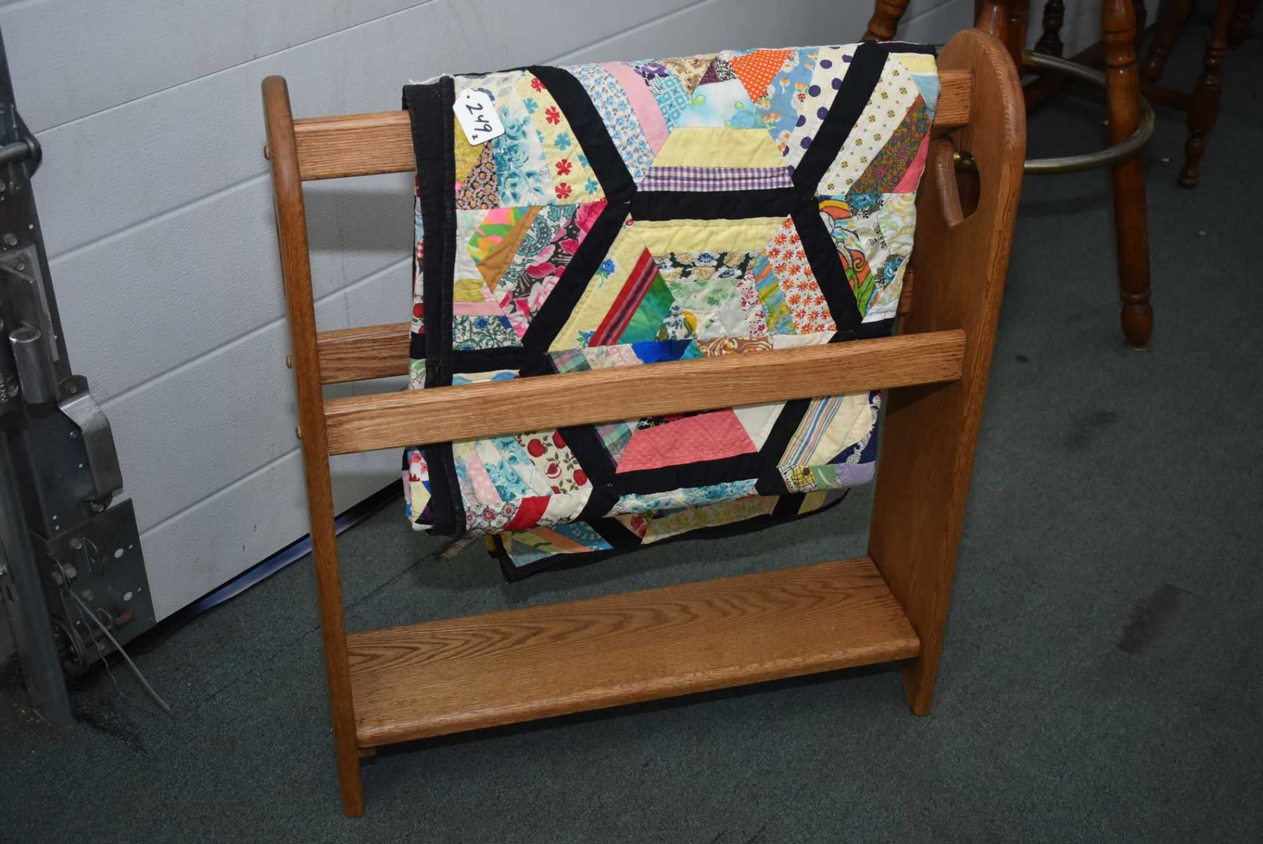 Oak quilt rack and a vintage hand pieced cotton quilt