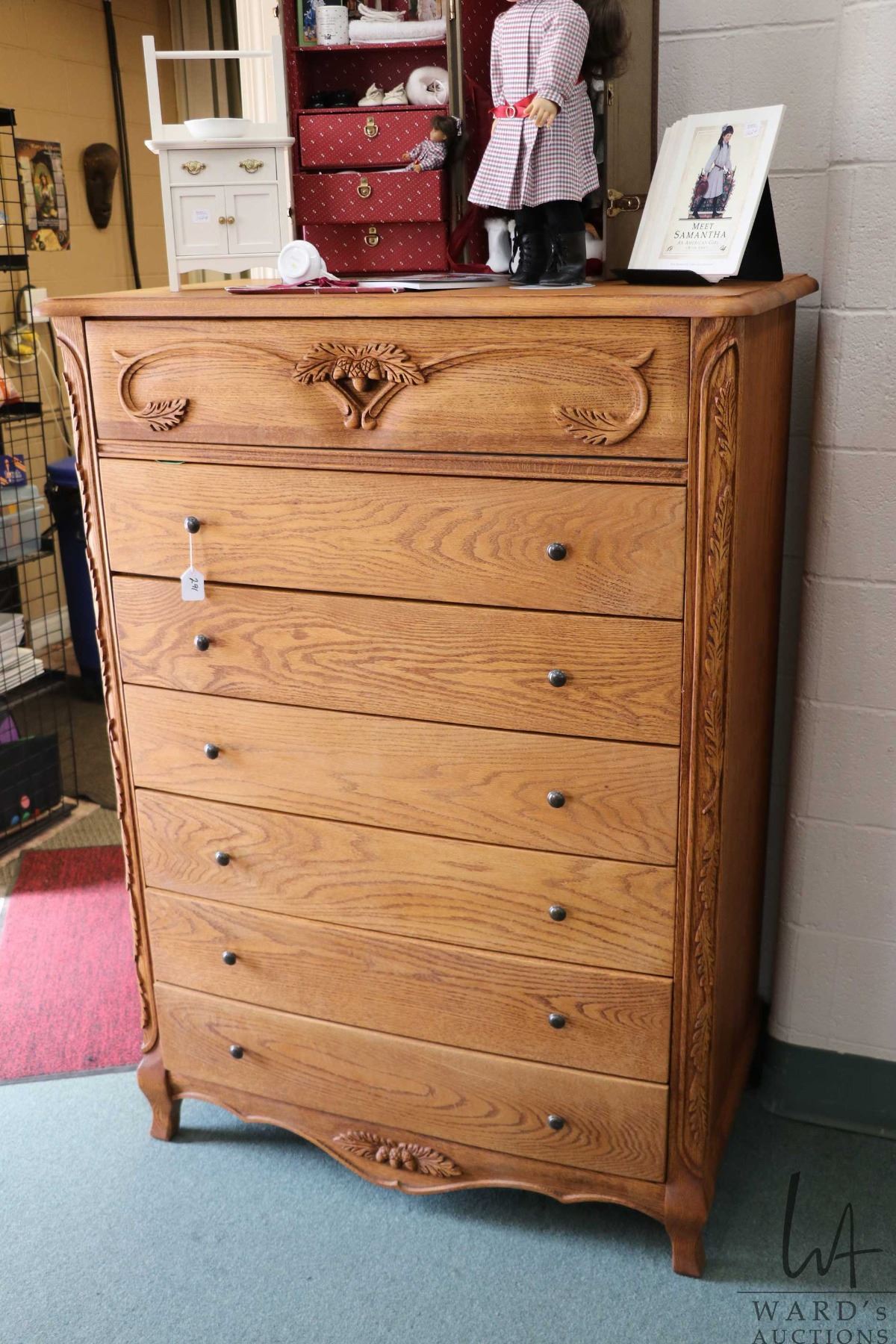 Oakwood Interior Versaille Collection seven drawer highboy, fitted with modern drawer slides, 57" H X 40" W X 24" D