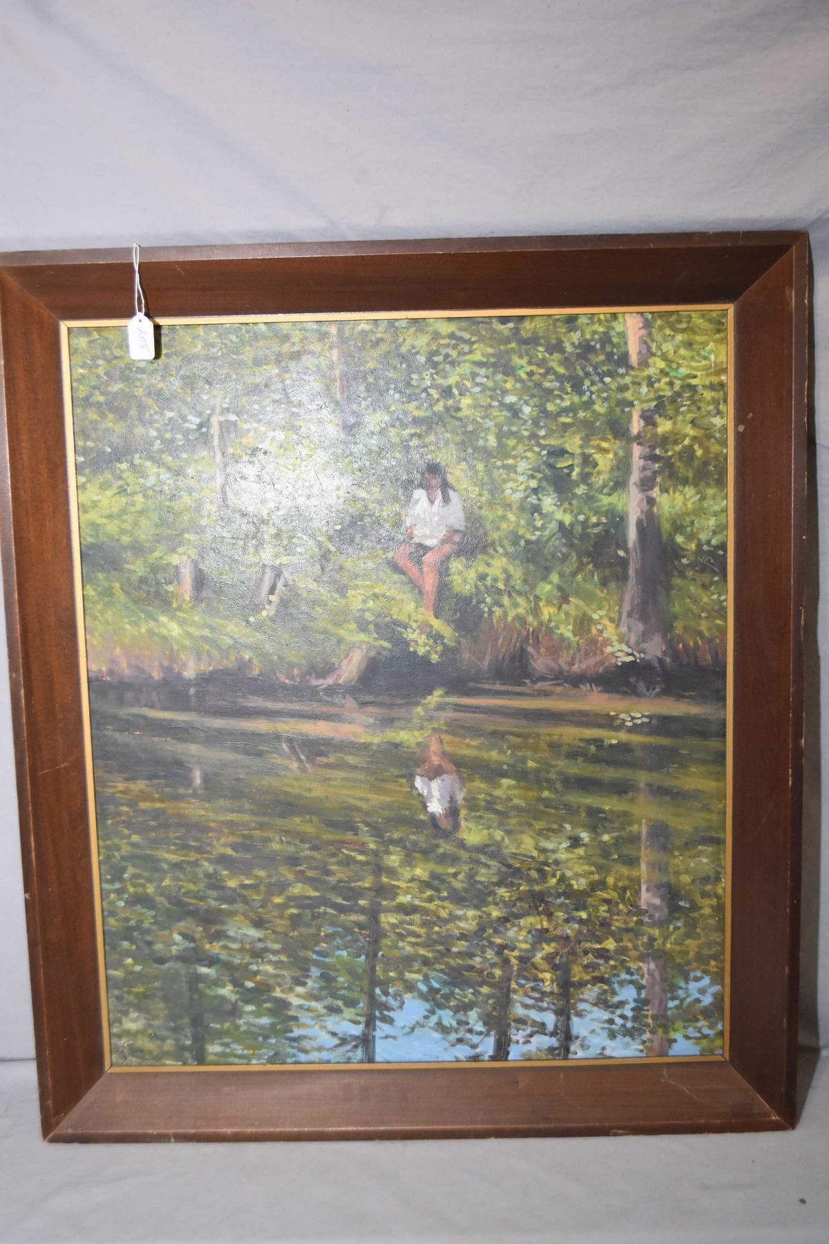 Oil on board painting of figure on a lake side with reflection, unsigned Crane Thomas consigned by artist's family 26" X 22"