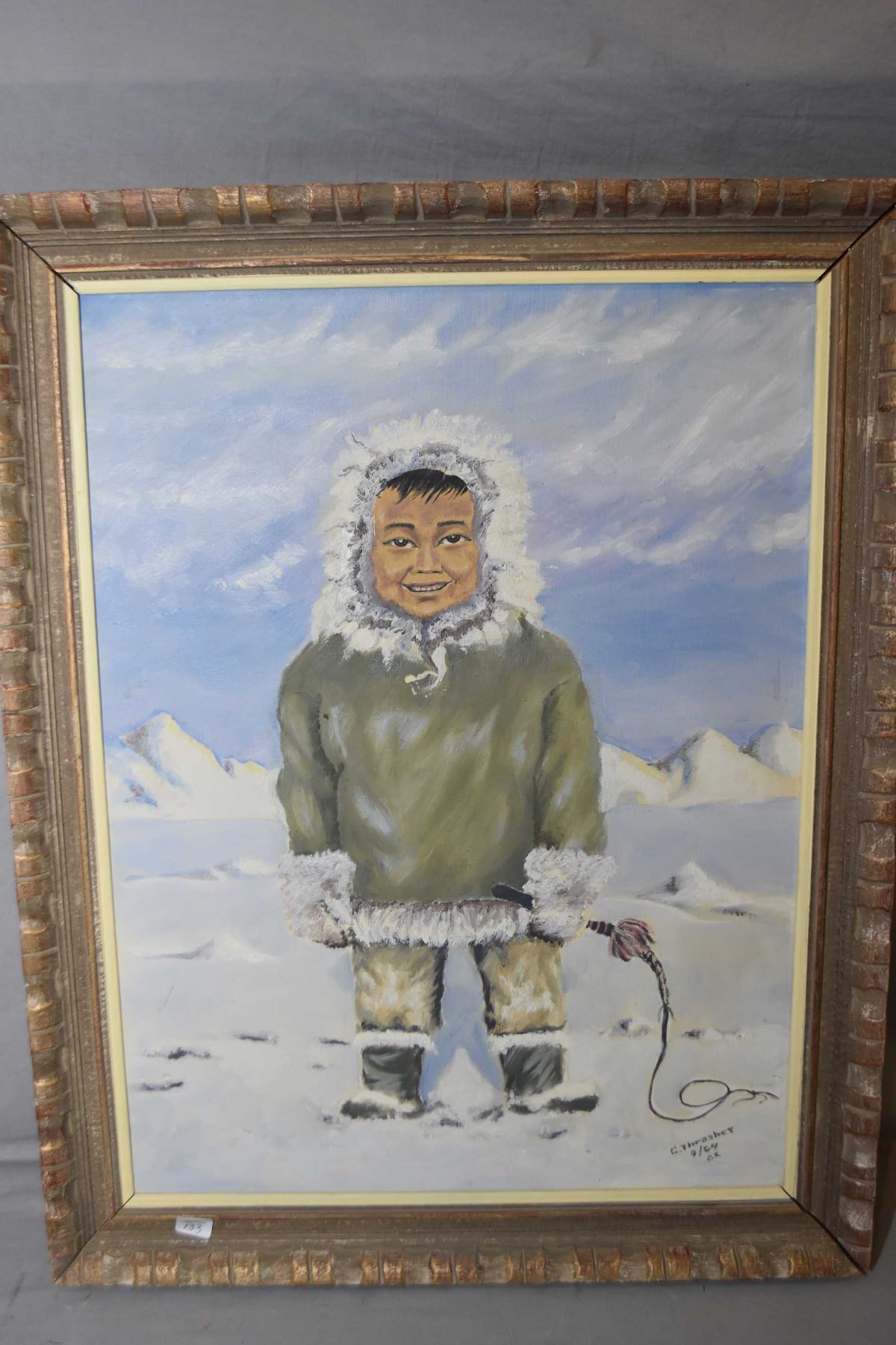 Oil on canvas painting of a young Inuit boy signed by artist C. Thrasher 24" X 18"