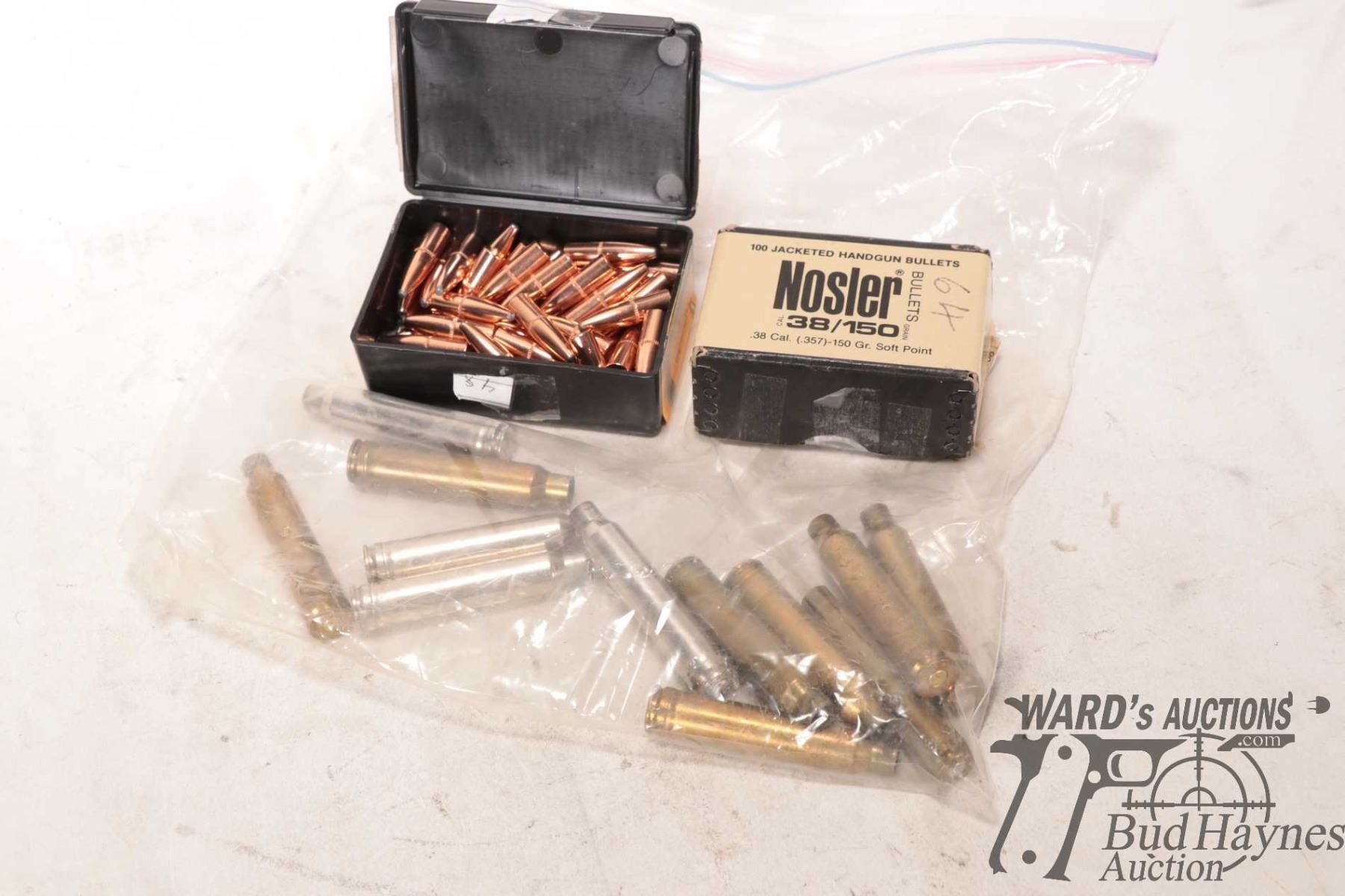 One 64 count box Nosler .38 cal 150 gr soft point One 64 count box Nosler .38 cal 150 gr soft point and one 48 count box Speer .30 cal 180 gr grand slam SP plus 12 .300 win mag brass