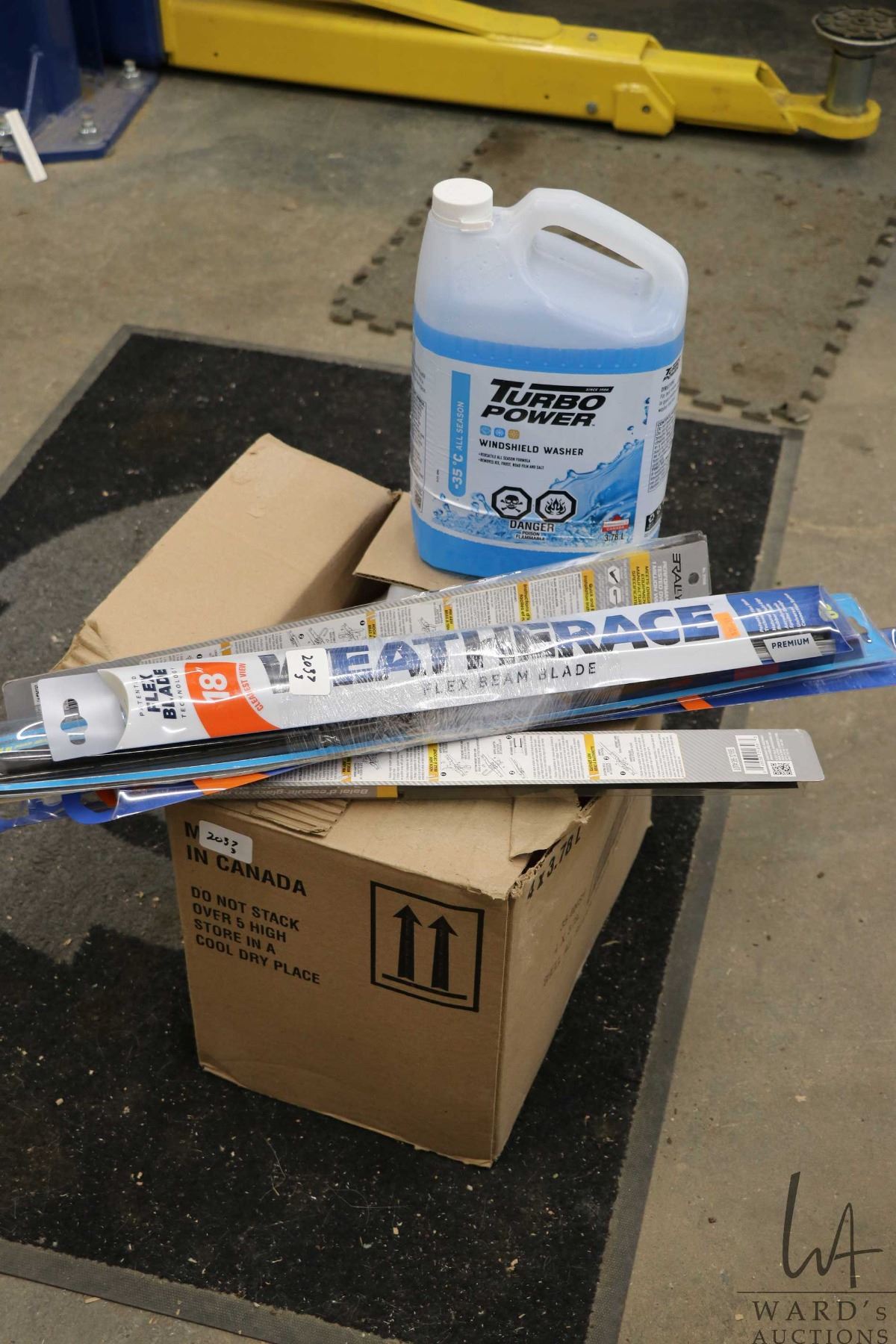 One case of Turbo Power gug wash with four 3.78 ltr jugs, one 3.78lt jug of Winter washer fluid and a selection of wiper blades