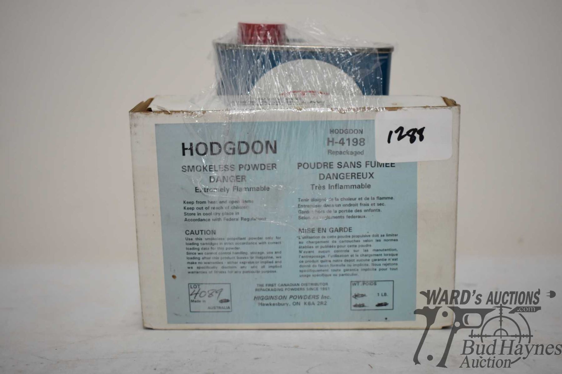 One full 1 lb container of Hodgdon H-4198 gun powder and a partial tin of MIR 4198 (approx. 1/3)