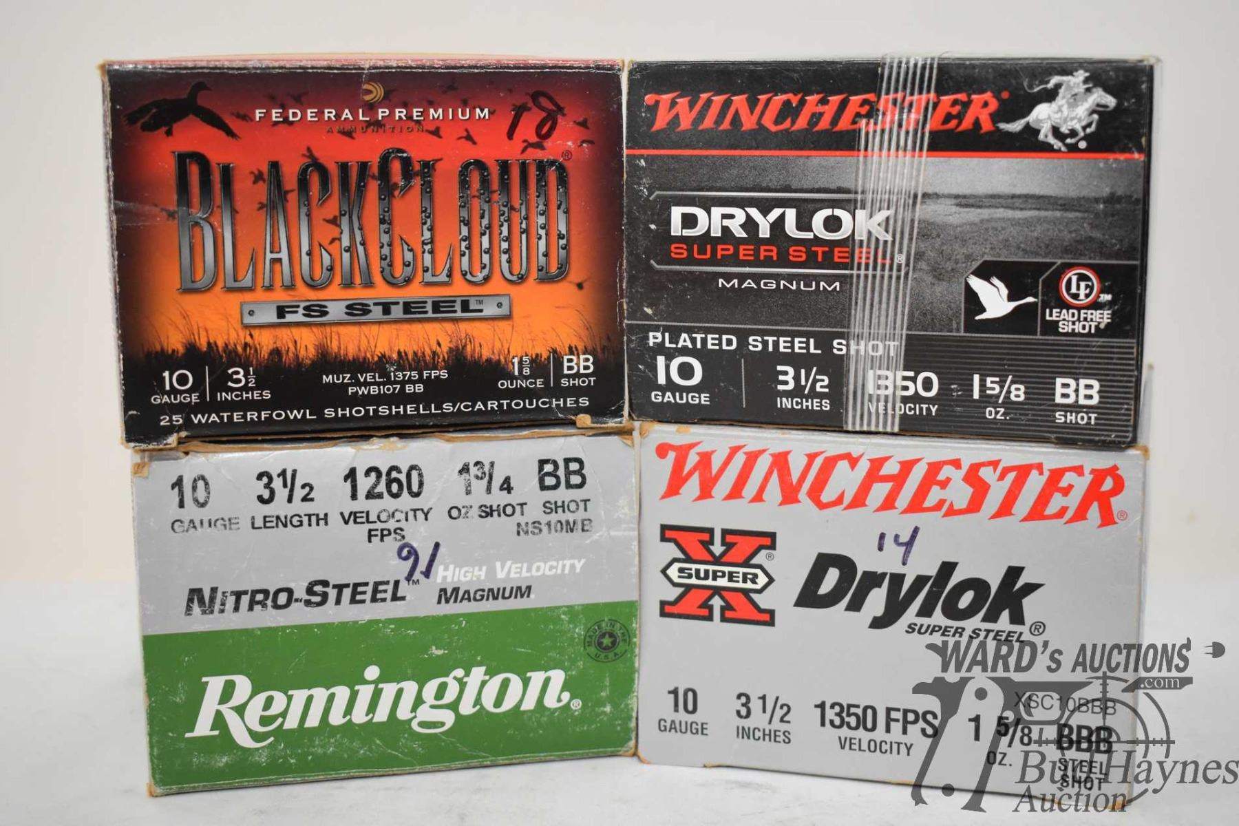One full 25 count box Winchester Drylok 10 GA 3 1/2" BB, one partial 18 count box Federal black cloud 10 GA 3 1/2" BB, one partial 16 count box Remington Nitro Steel 10 GA 3 1/2" BB and a partial 14 count box Winchester Drylok 10 GA 3 1/2" BBB