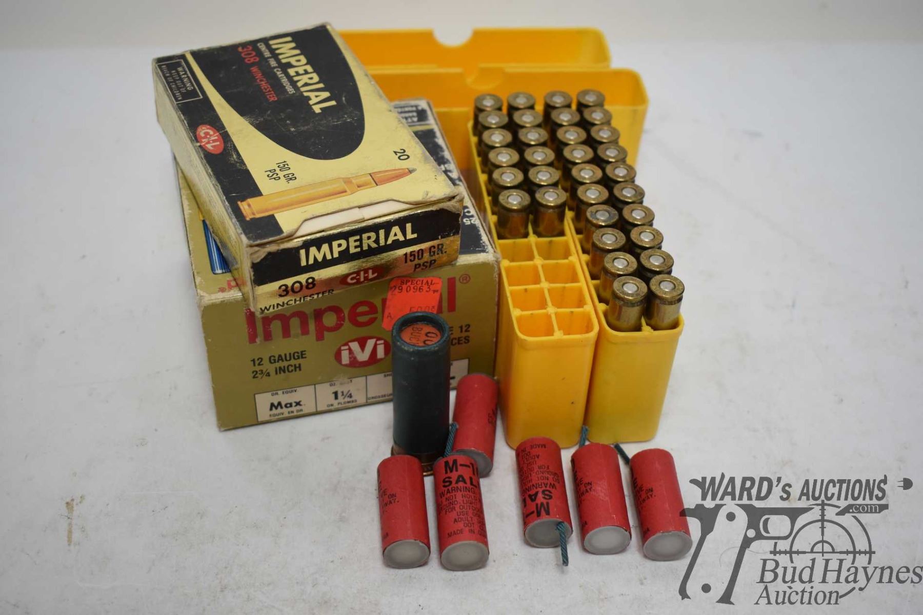 One partial 17 count box Imperial .308 win 150 gr PSP and 32 rounds of .308 reloads, plus an 11 count box Imperial 2 3/4" 12 GA #4, one 12 GA 2 3/4" buckshot and six small warning explosives