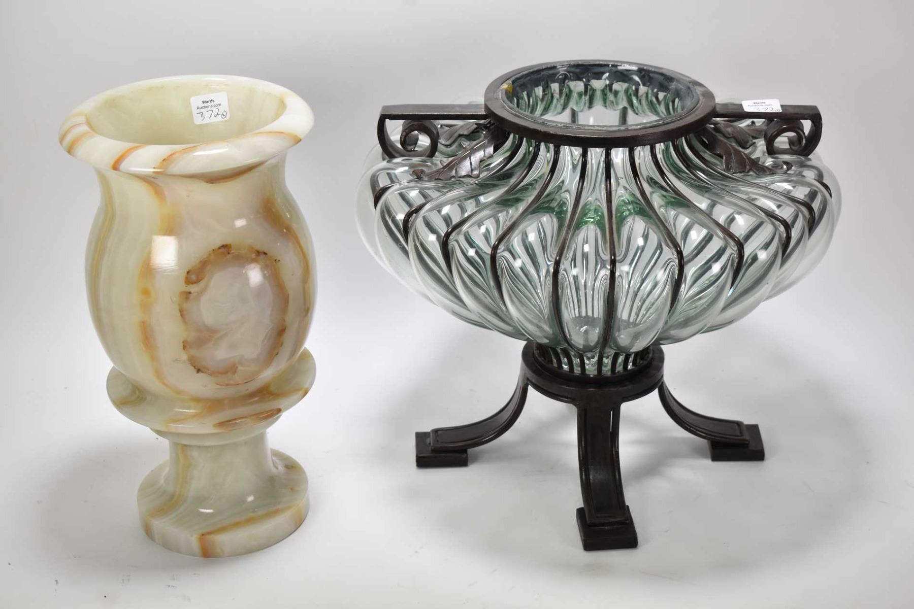 Onyx baluster vase 12" in height and a hand blown double handled glass vase with metal galley