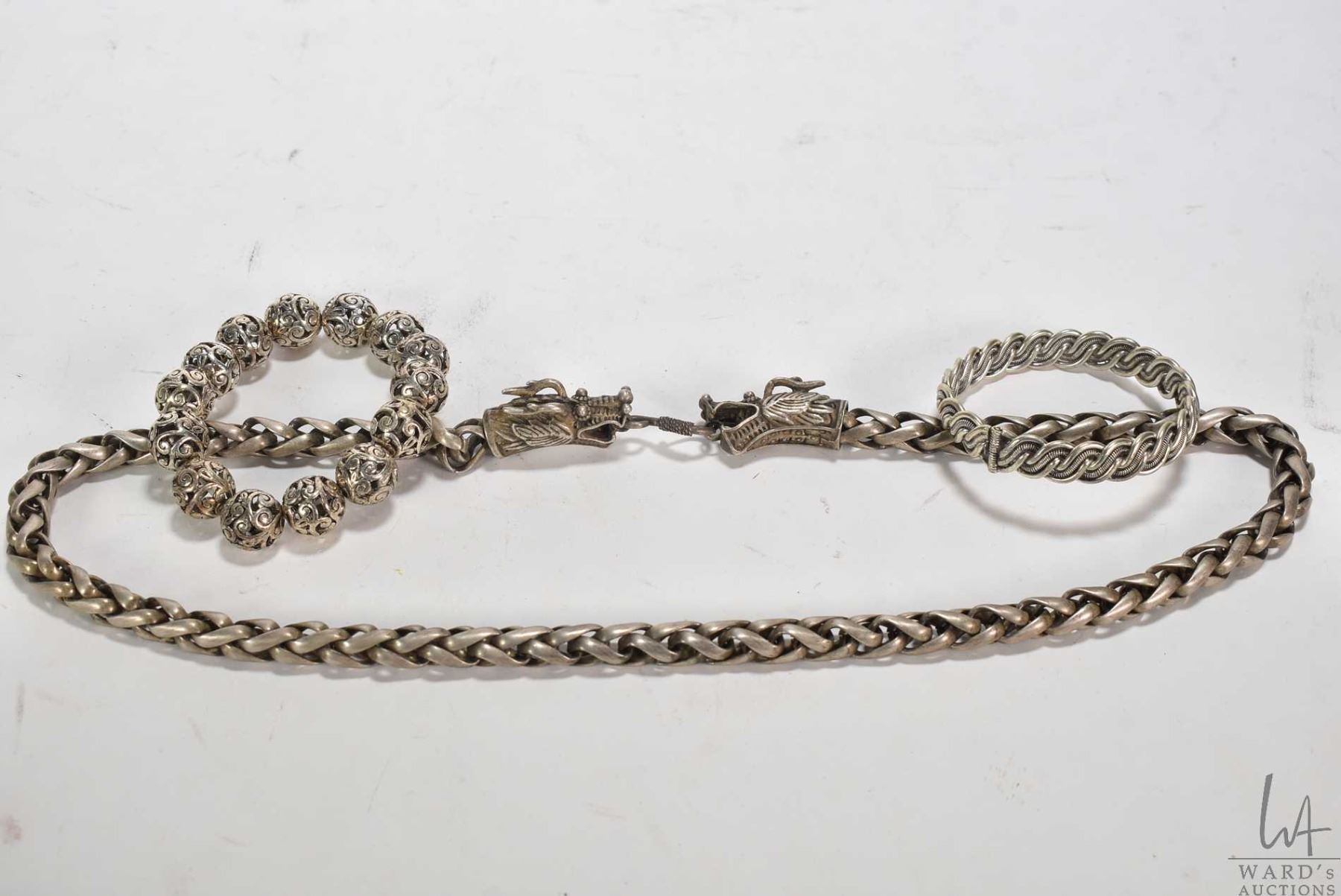 Open work white metal spherical bead bracelet, a twisted bracelet and a heavy white metal "Dual dragon" blessing necklace