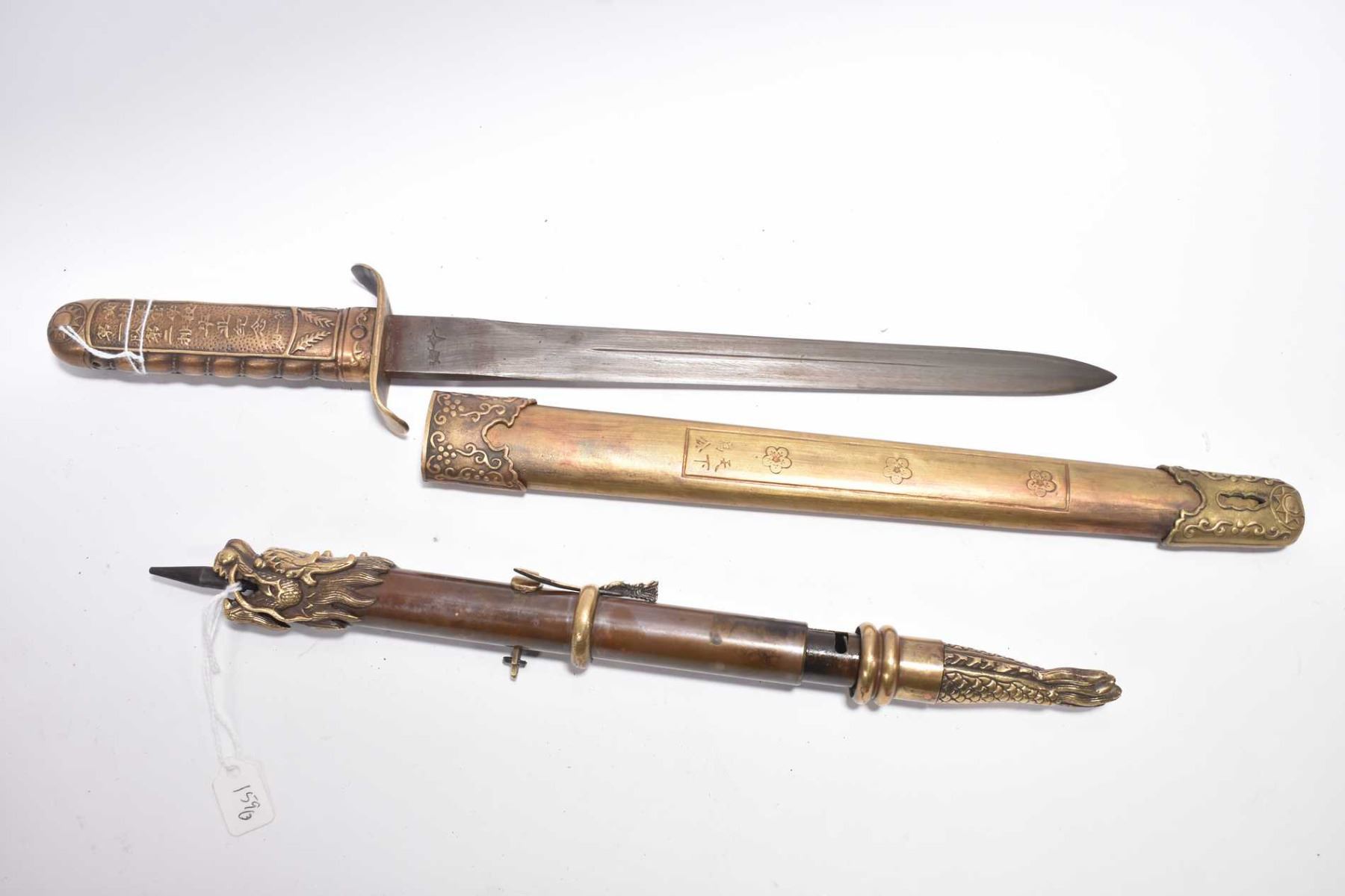 Oriental metal sleeve arrow, an Imperial Japanese dagger buckle and a Japanese ceremonial Sakura dagger