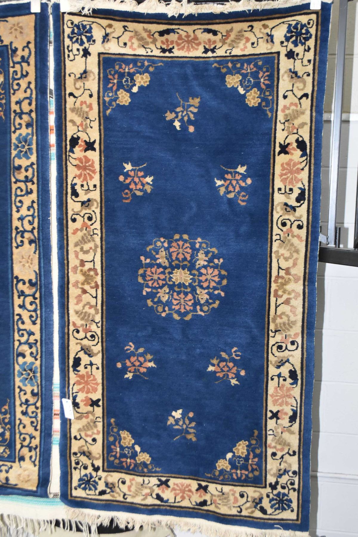 Oriental wool area rug with center medallion, floral decoration and border in shades of Royal blue and tan, 36" X 70"