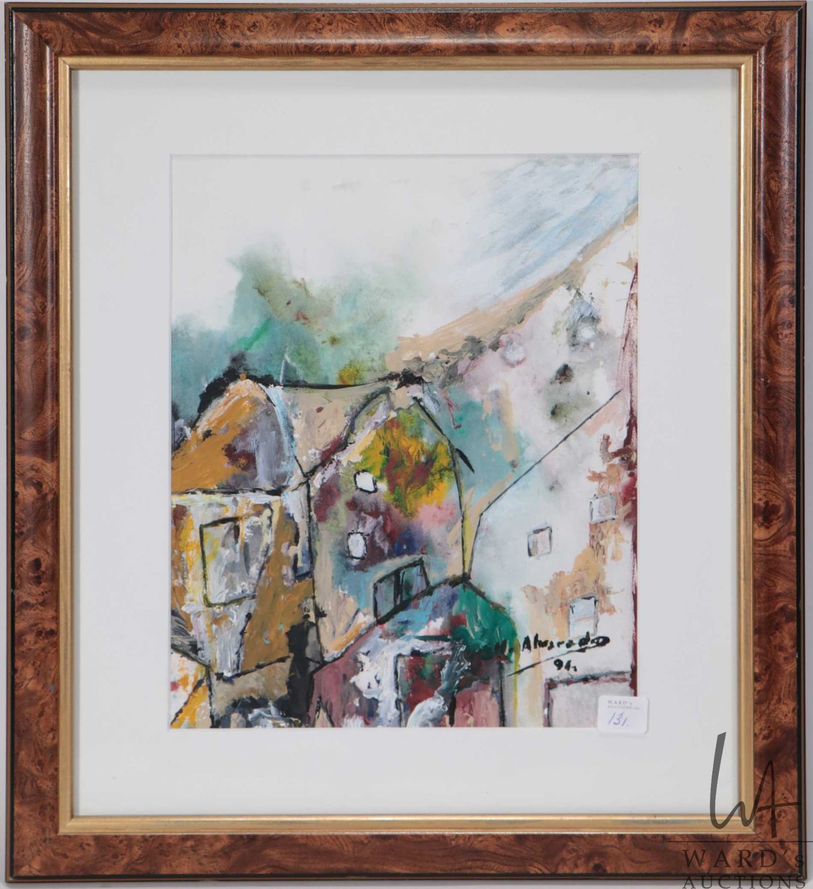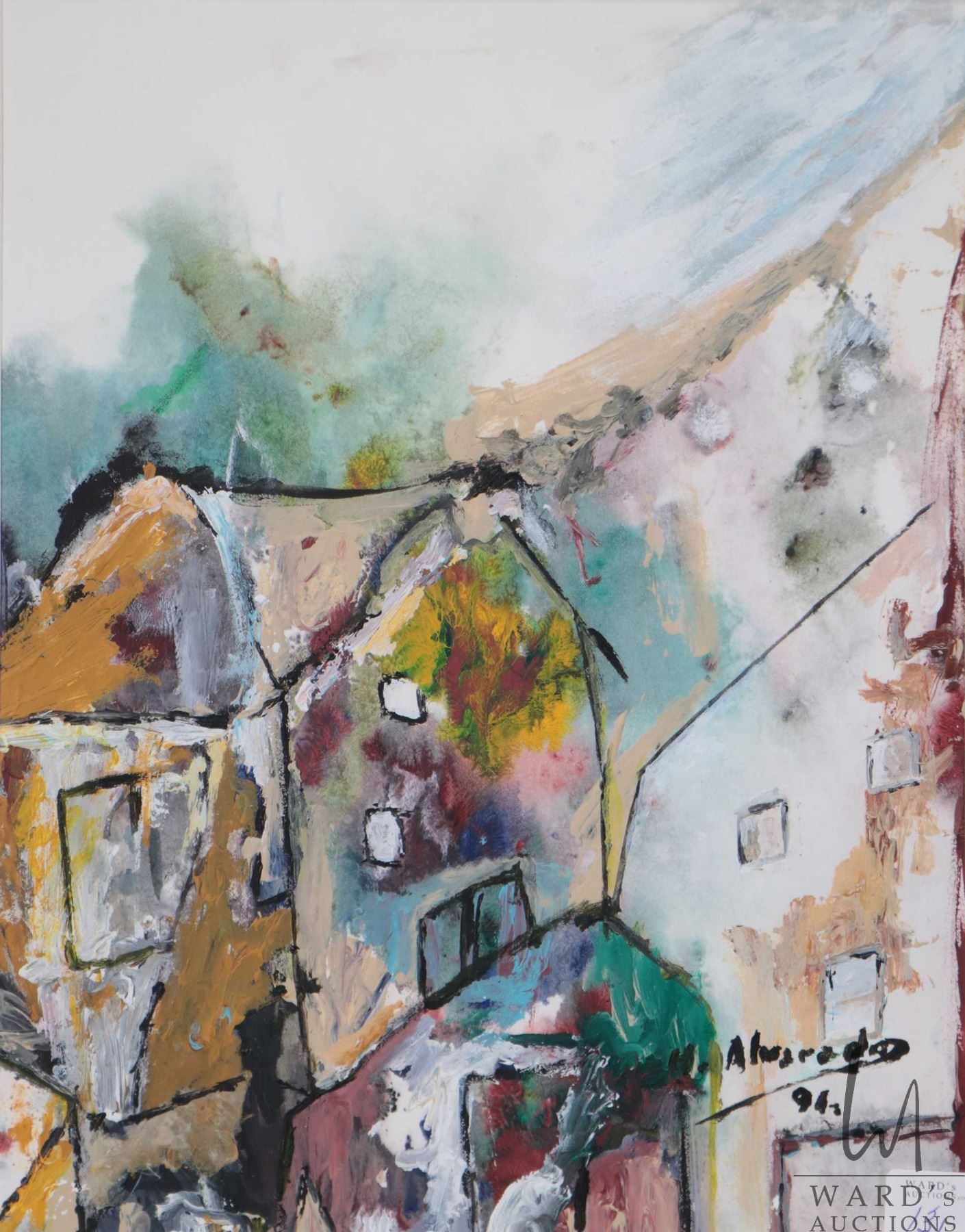 Original acrylic on paper painting titled "In the Village" and signed by artist Hugo Alvarado '91, 12" X 9 1/2"
