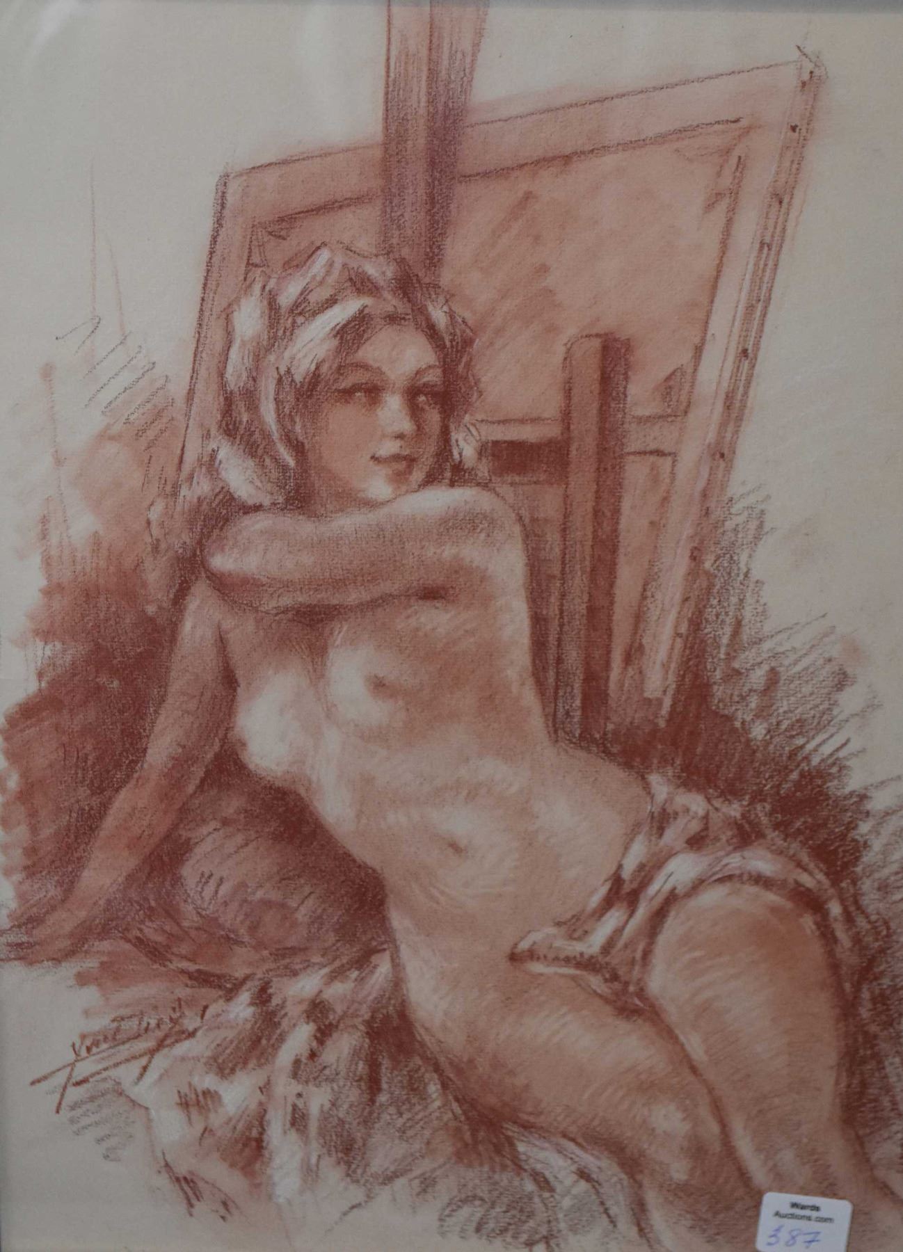 Original sanguine chalk drawing of a nude by French artist Yves Diey, 14" X 10"