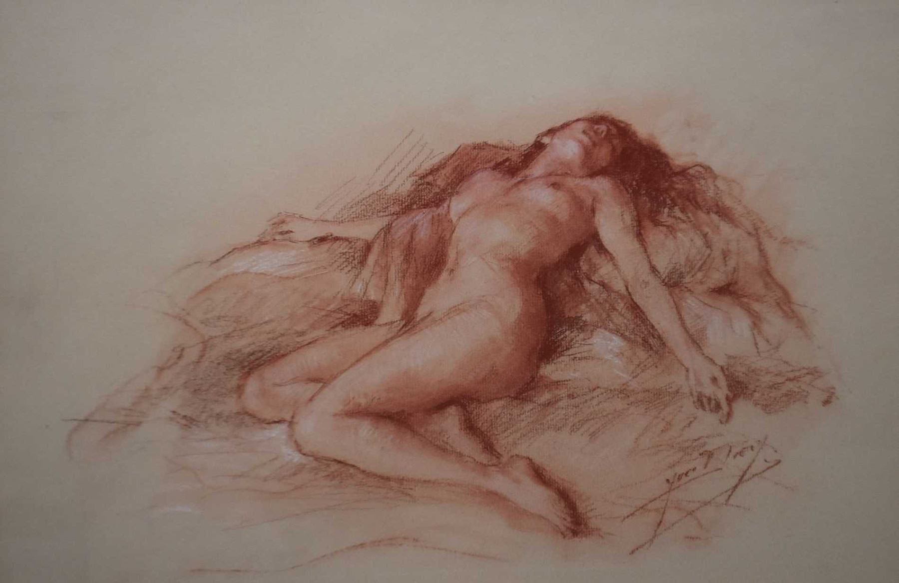 Original sanguine chalk drawing of a nude by French artist Yves Diey, 9 1/2" X 13"