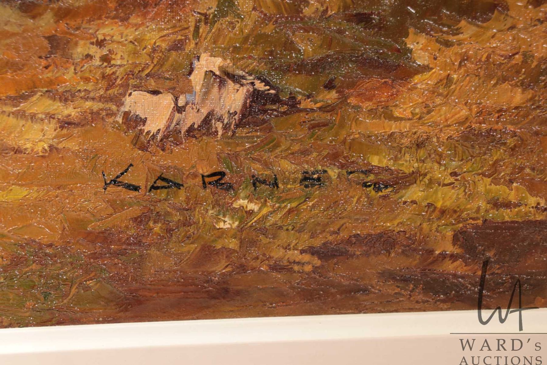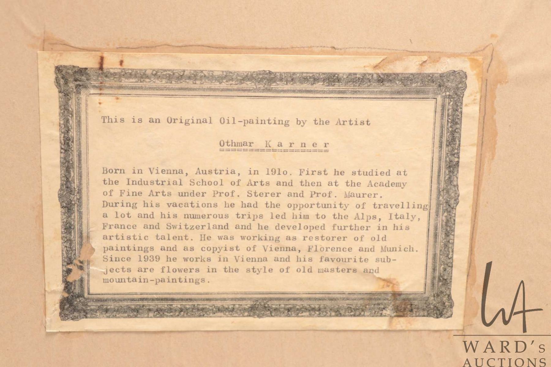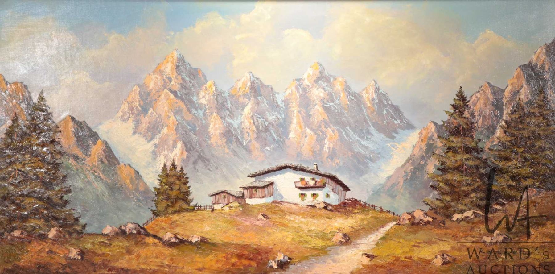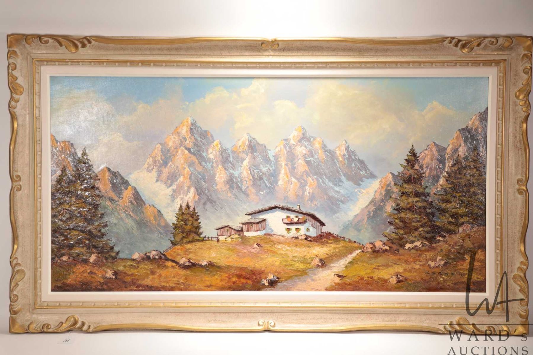 Othmar Karner, framed original oil on board painting of a swiss chalet in the alps 23-1/2" x 47-1/2"
