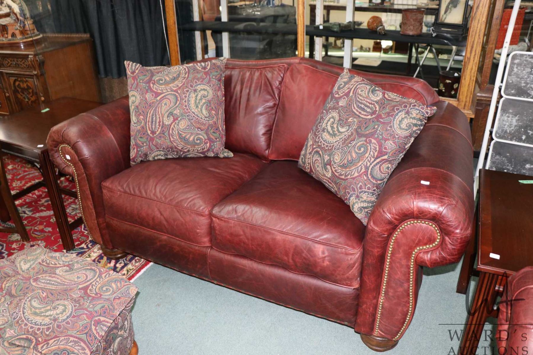Ox-blood leather upholstered and nail head decorated La-Z-boy loveseat with three throw cushions from the Canadian Home Collection