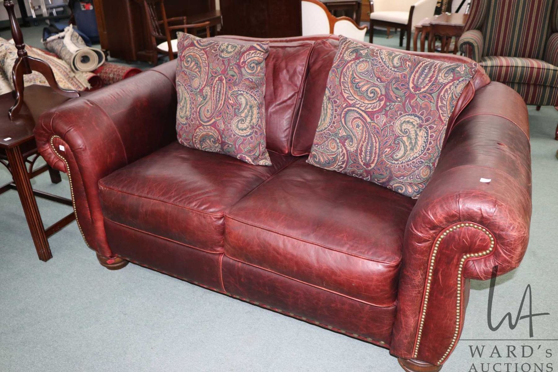 Ox-blood leather upholstered and nail head decorated La-Z-boy loveseat with three throw cushions fro