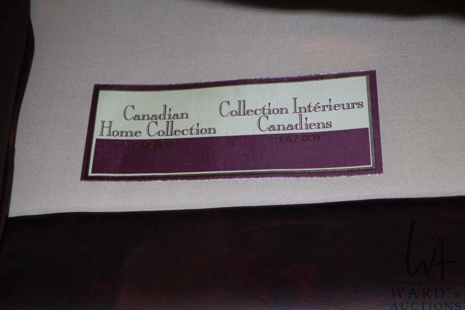 Ox-blood leather upholstered and nail head decorated La-Z-boy loveseat with three throw cushions from the Canadian Home Collection