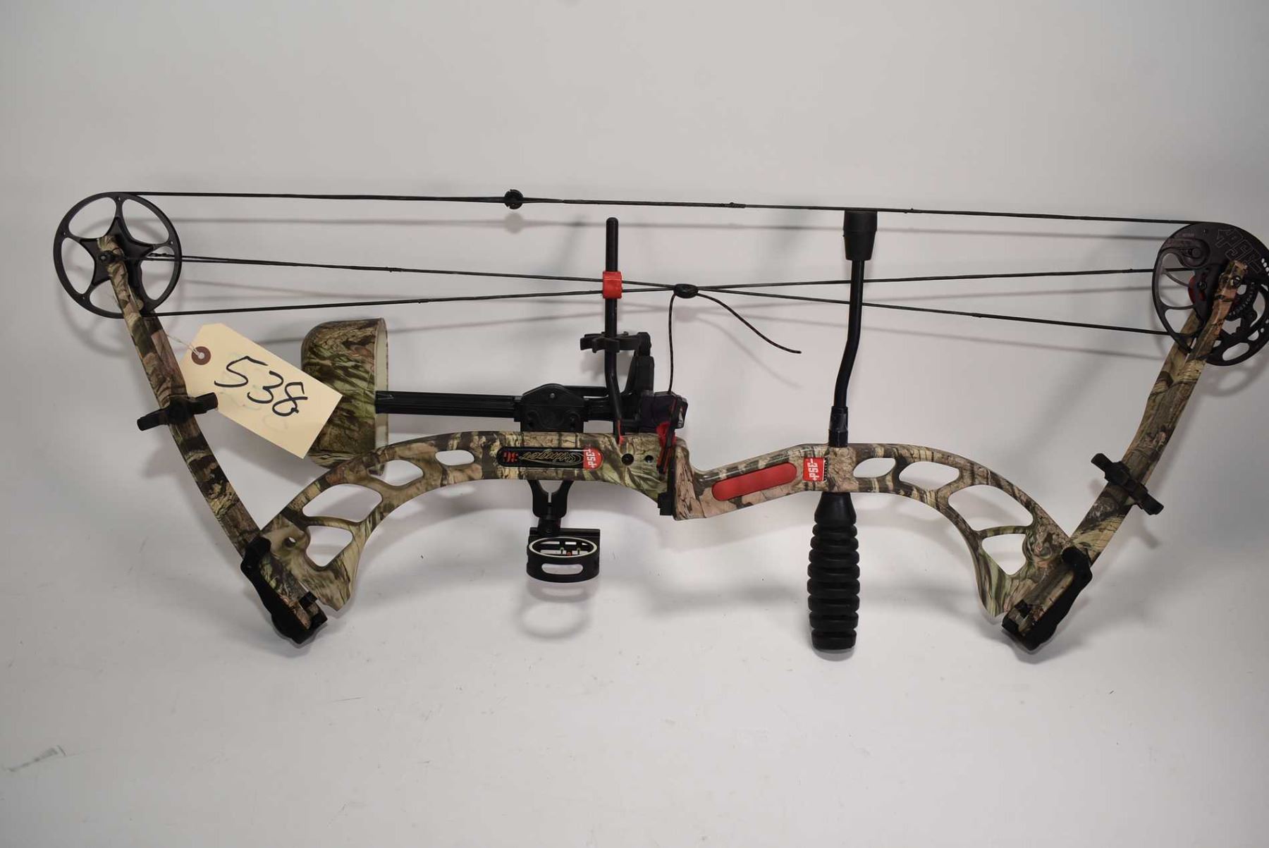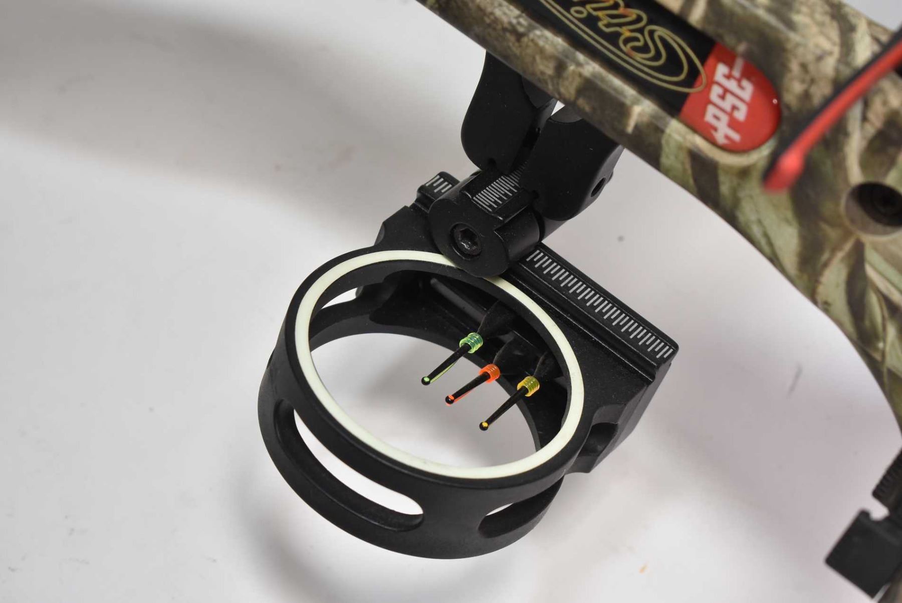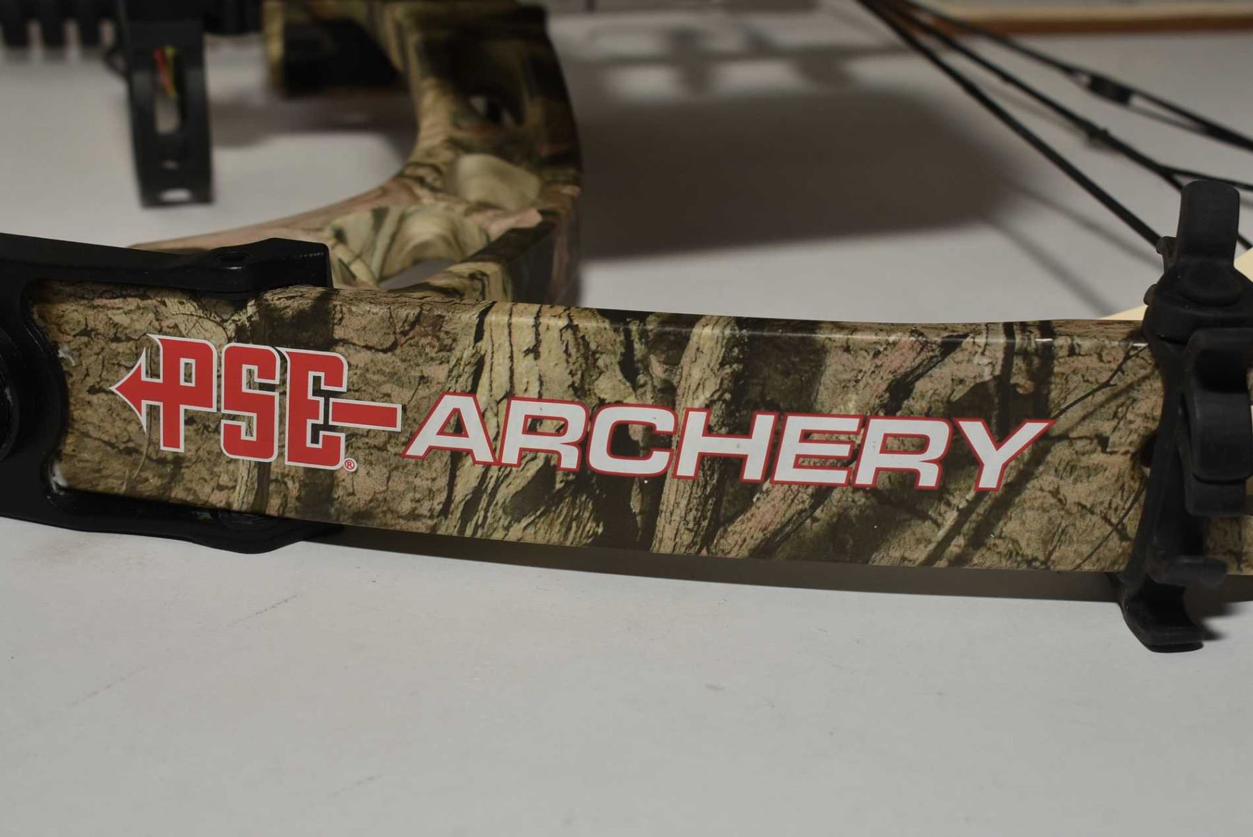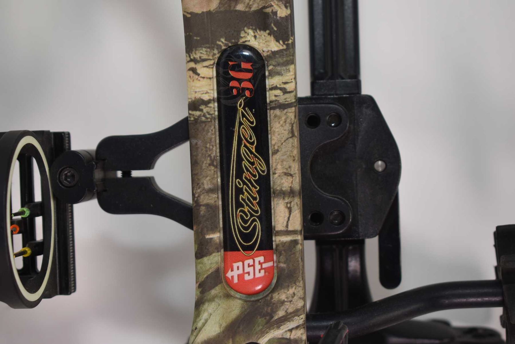 PSE Stinger 3G compound bow, 33" axial to axial with camouflage finish, attached Ripcord sight and multi arrow quiver