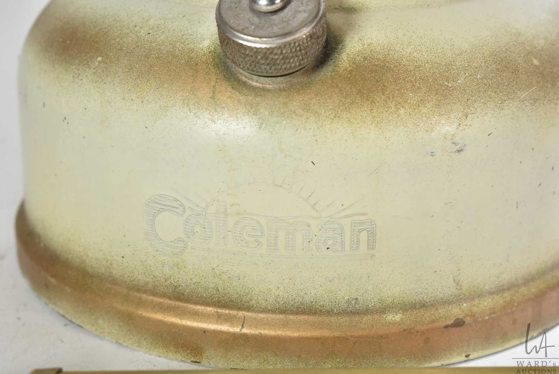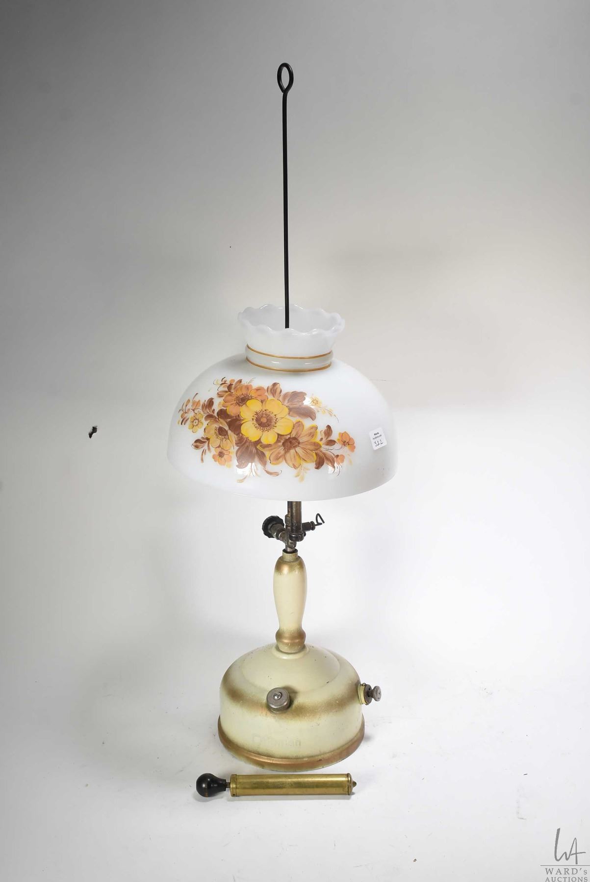 Painted Coleman kerosene lamp with hand painted milk glass shade, complete with built in pressure pump plus a brass hand pump