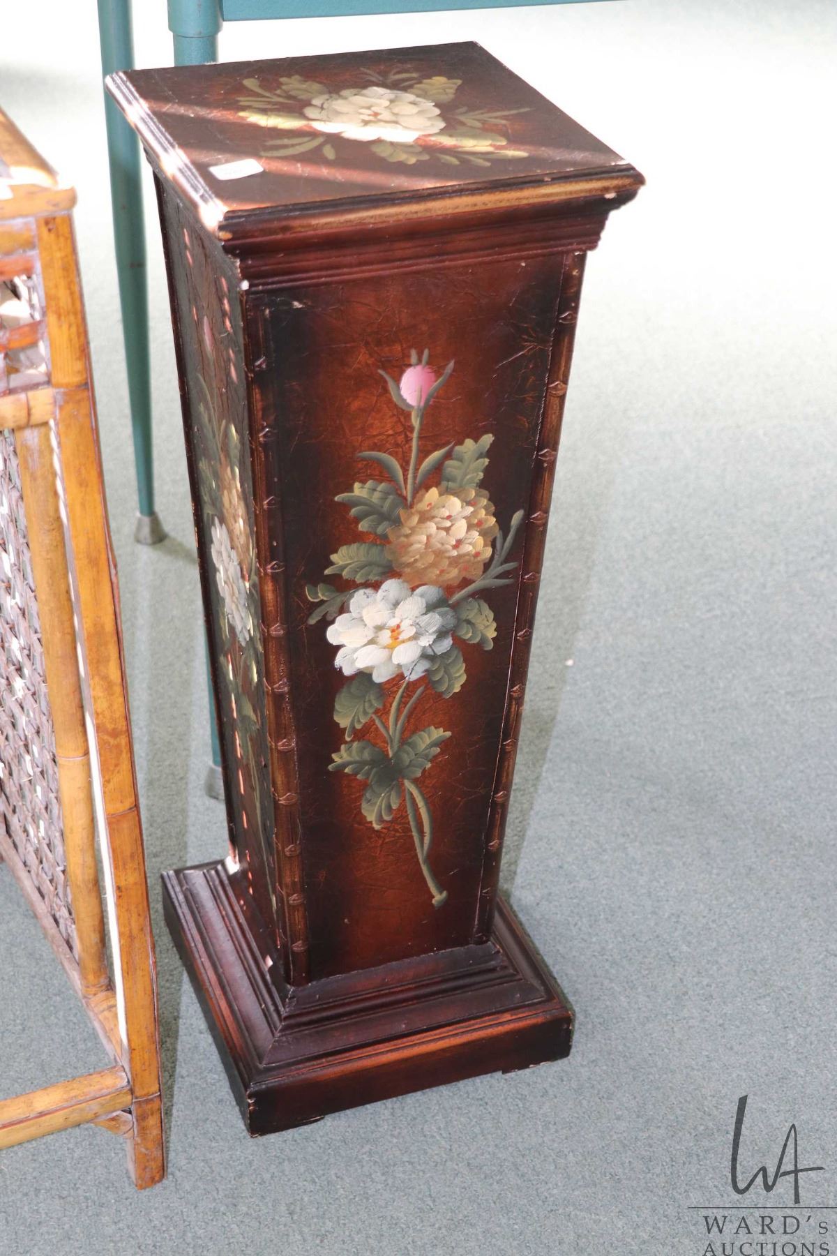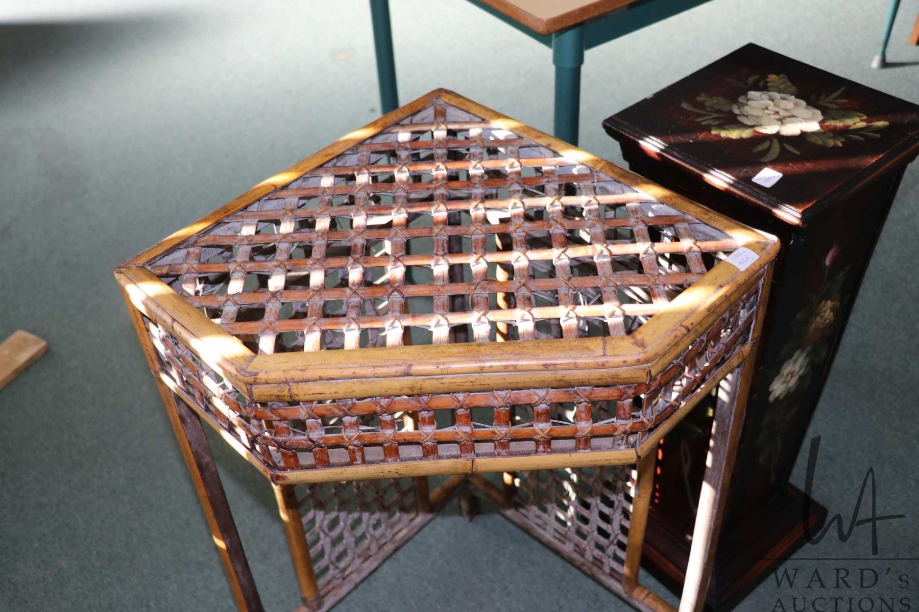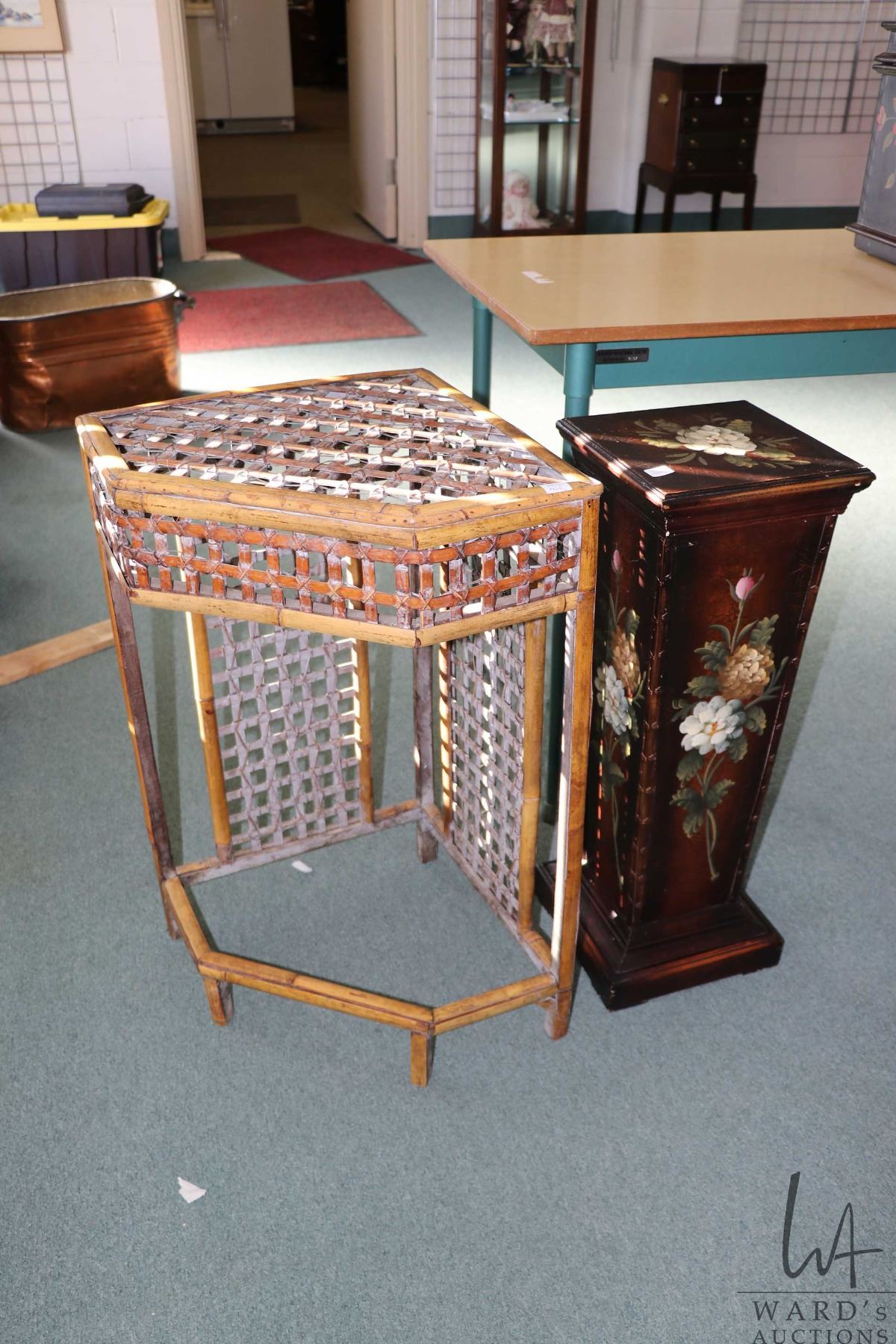 Painted floral motif statuary stand 27 1/2" in height and a woven bamboo corner table, missing bottom