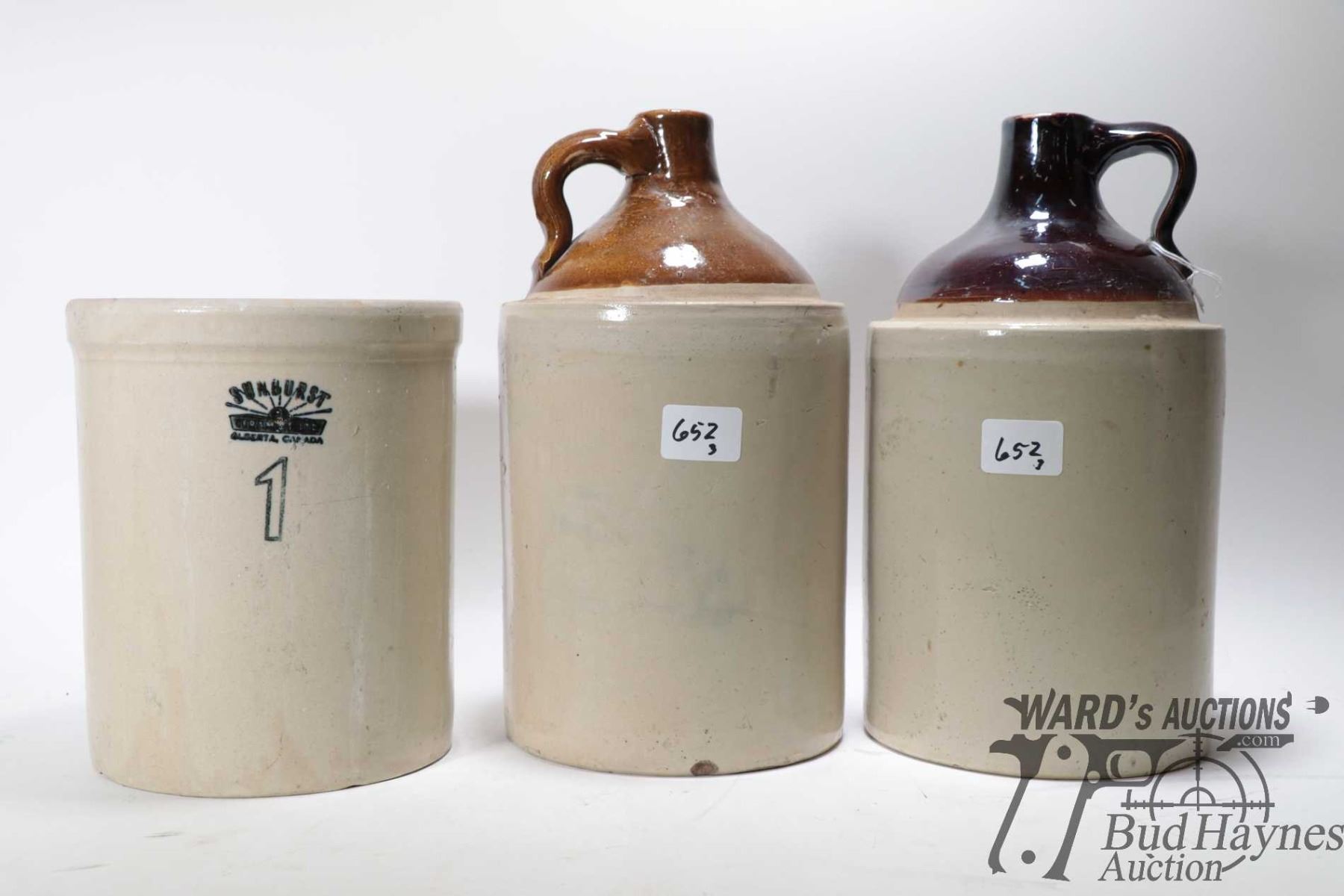 Pair of 1 gallon glazed pottery jugs and a Sunburst 1 gallon crock