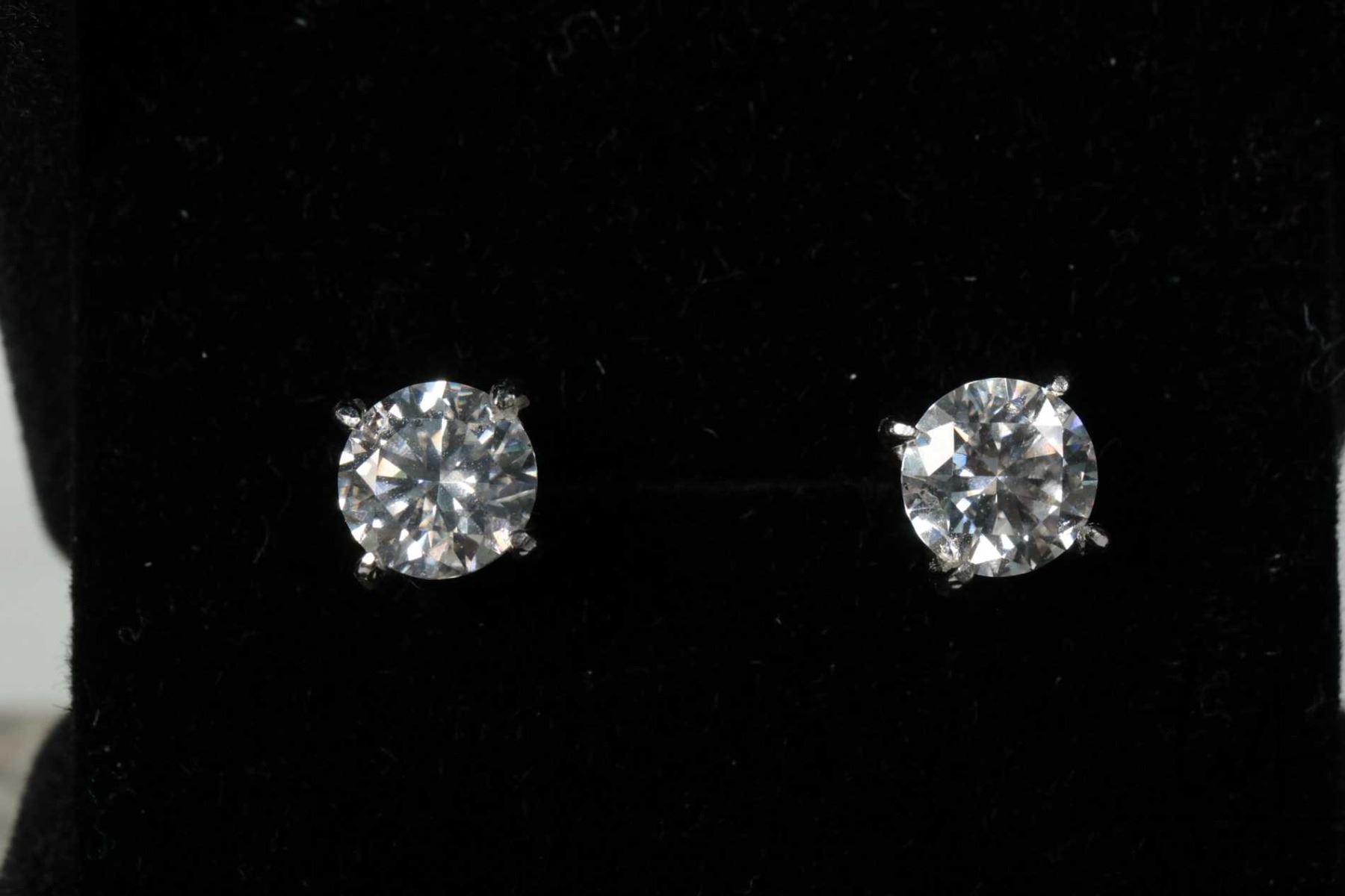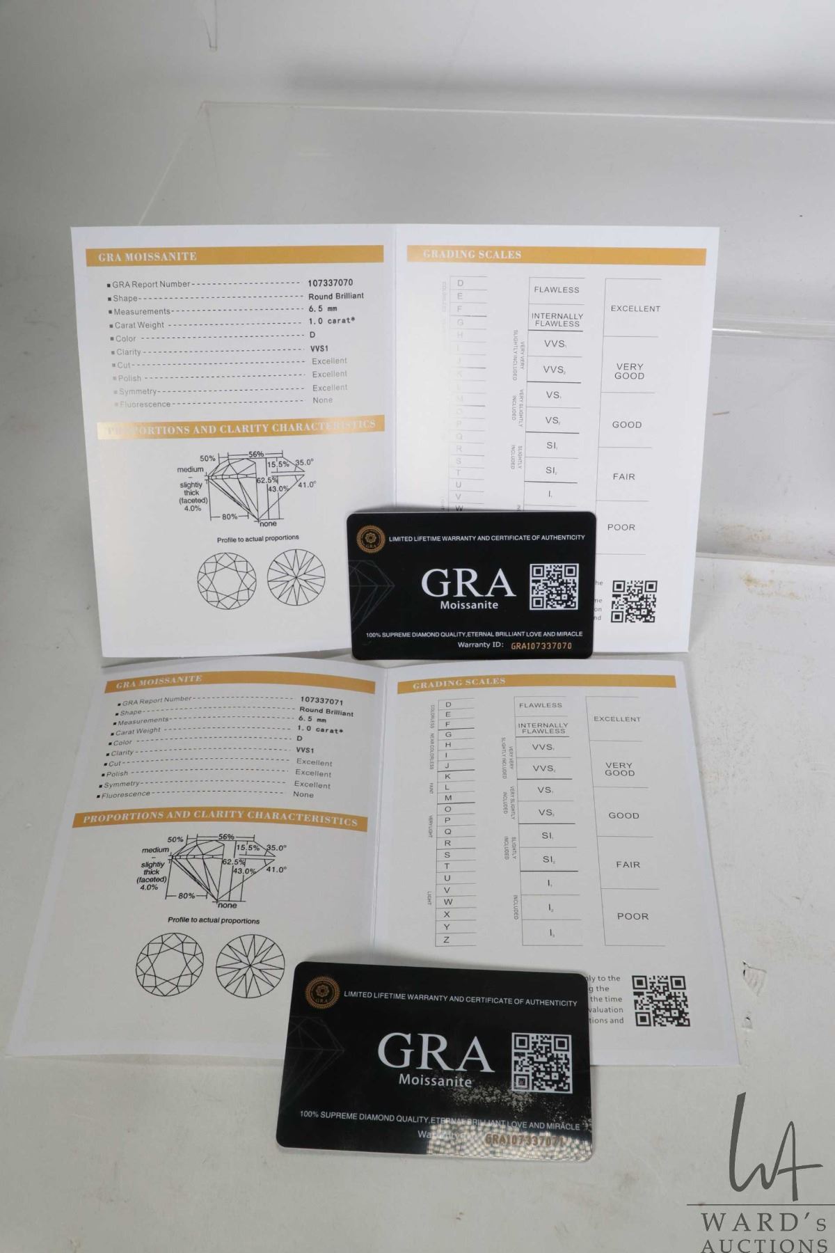 Pair of 14kt white gold solitaire earrings, each set with set with 1.00 ct moissanite gemstone, including GRA certification
