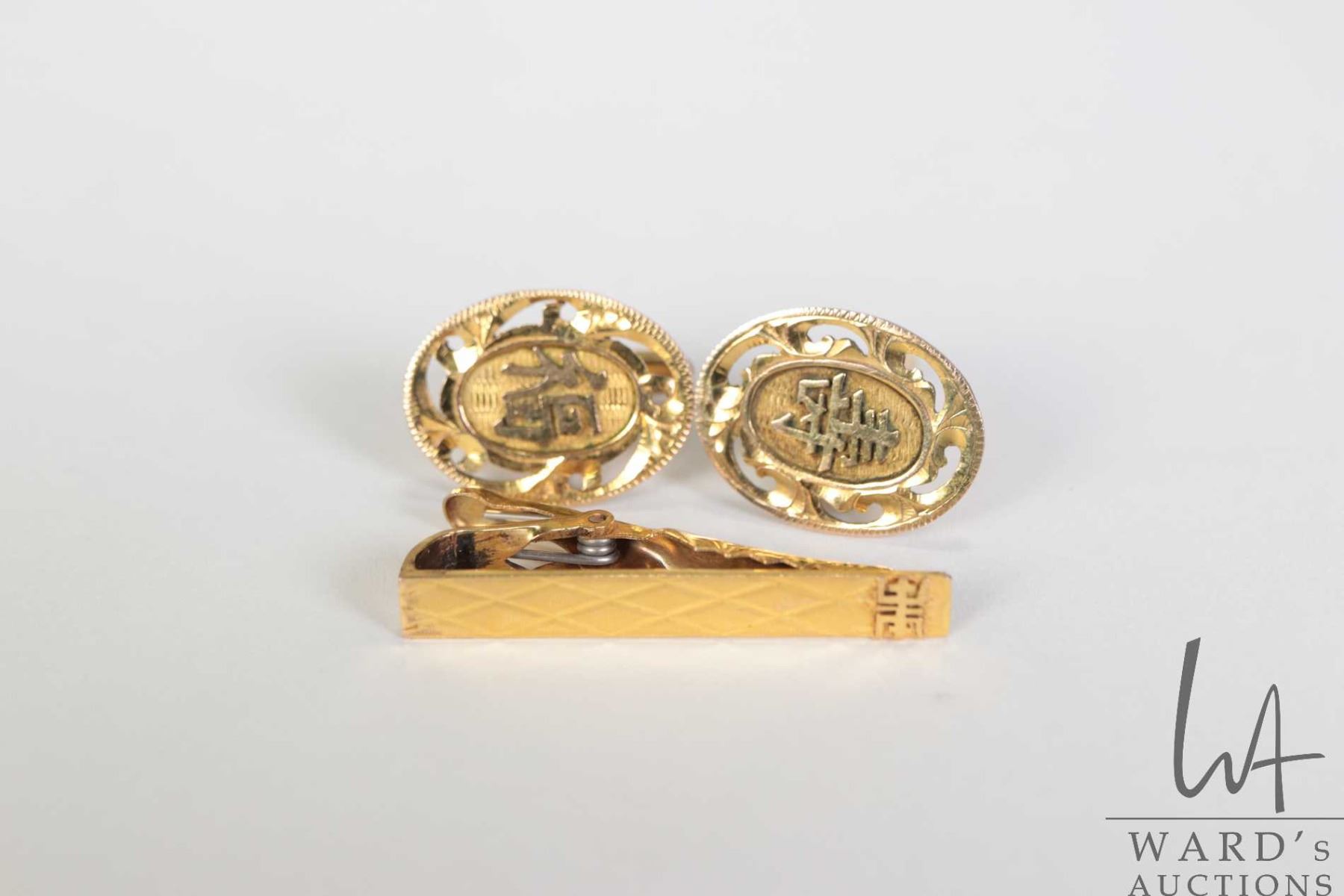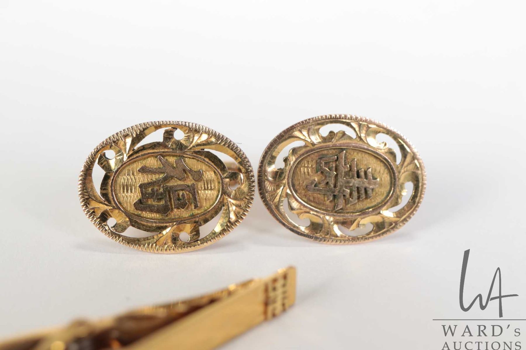 Pair of 14kt yellow gold cufflinks with Asian character design and a marked 14kt yellow gold tie clip