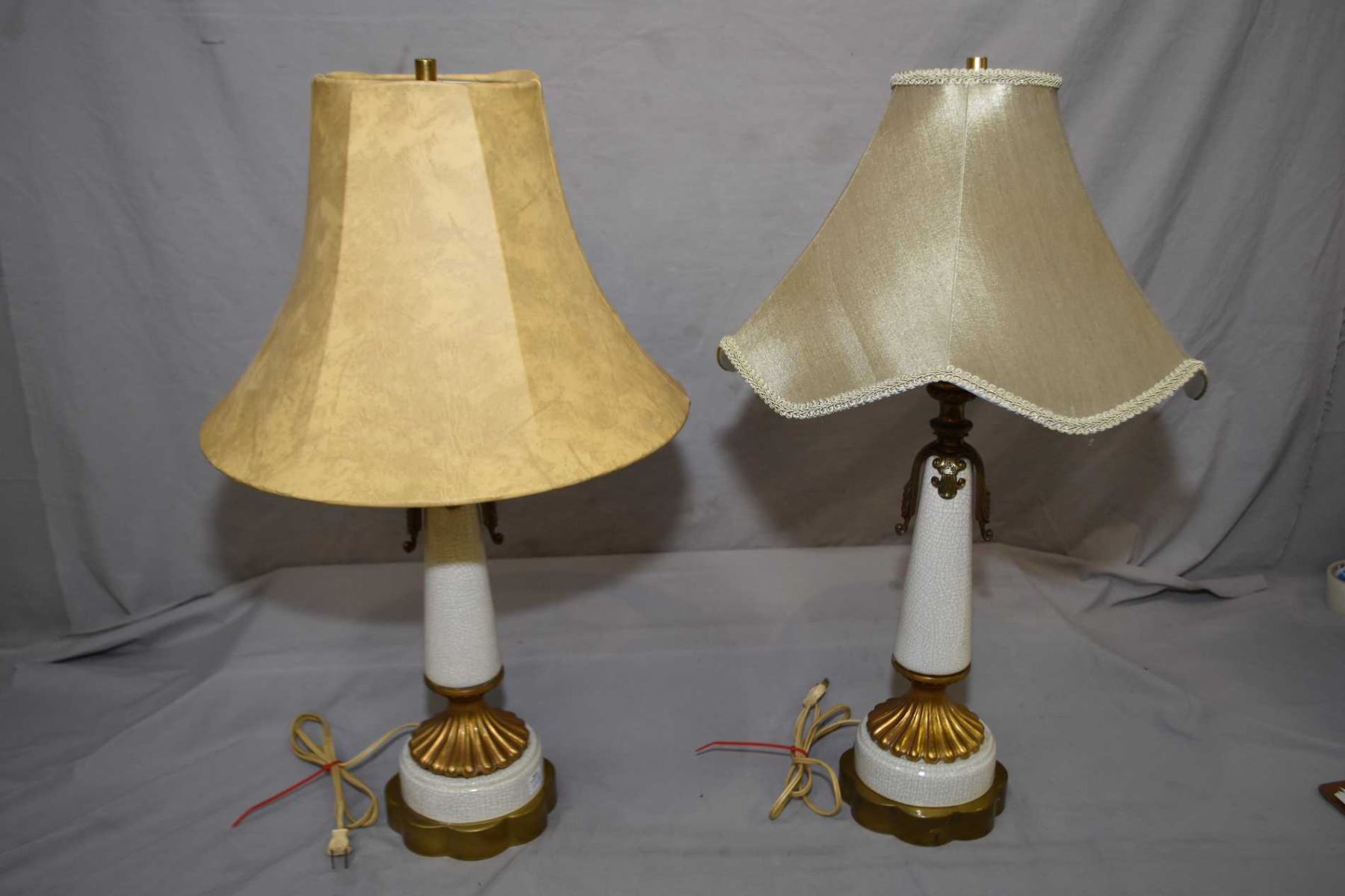 Pair of 27" table lamps with crackle ceramic and brass bases with mismatched shades