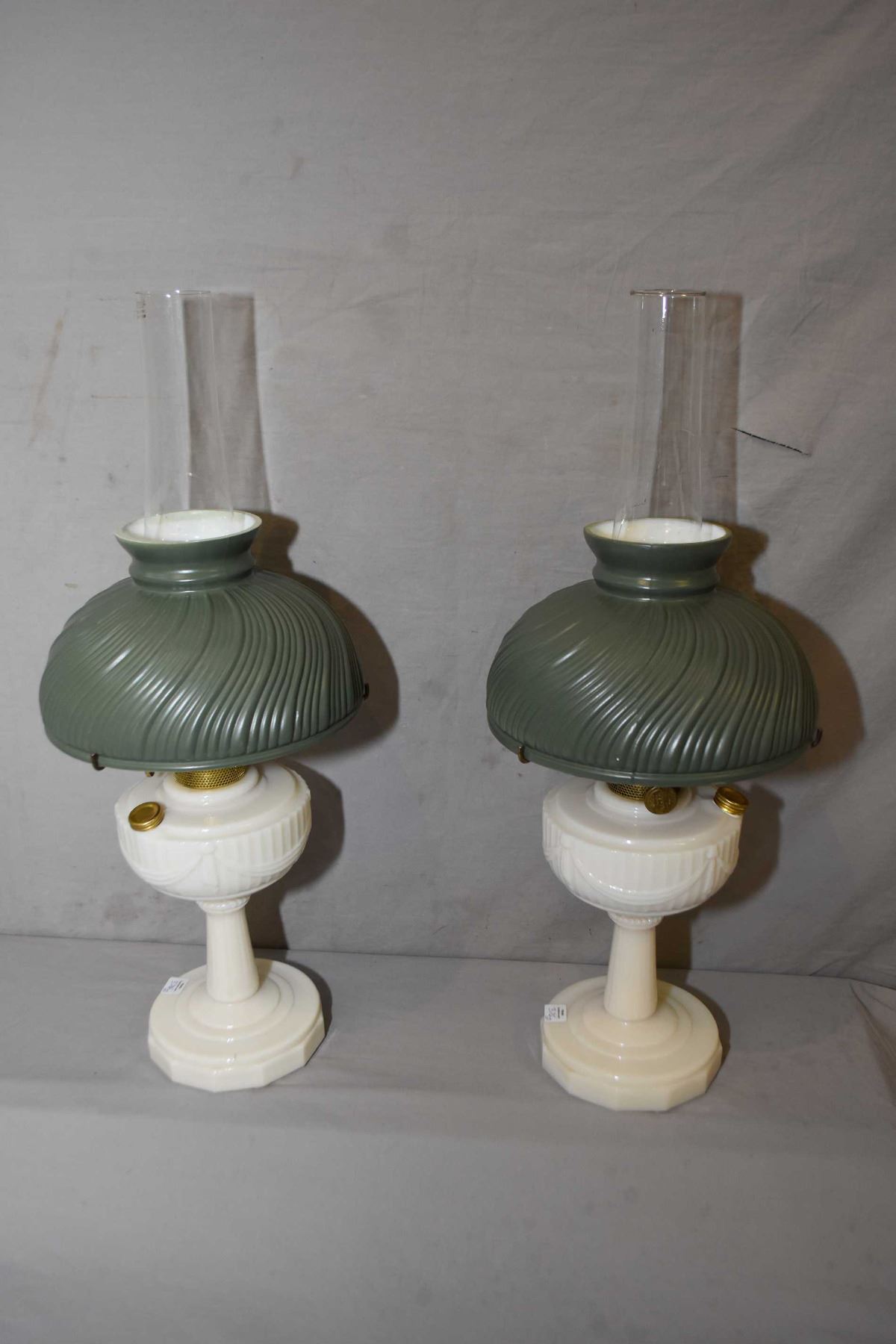 This Item Not Available For Shipping. Local Bidders Only. Pair of Aladdin Lincoln drape oil lamps with chimneys and cased green shades, note crack to one chimney