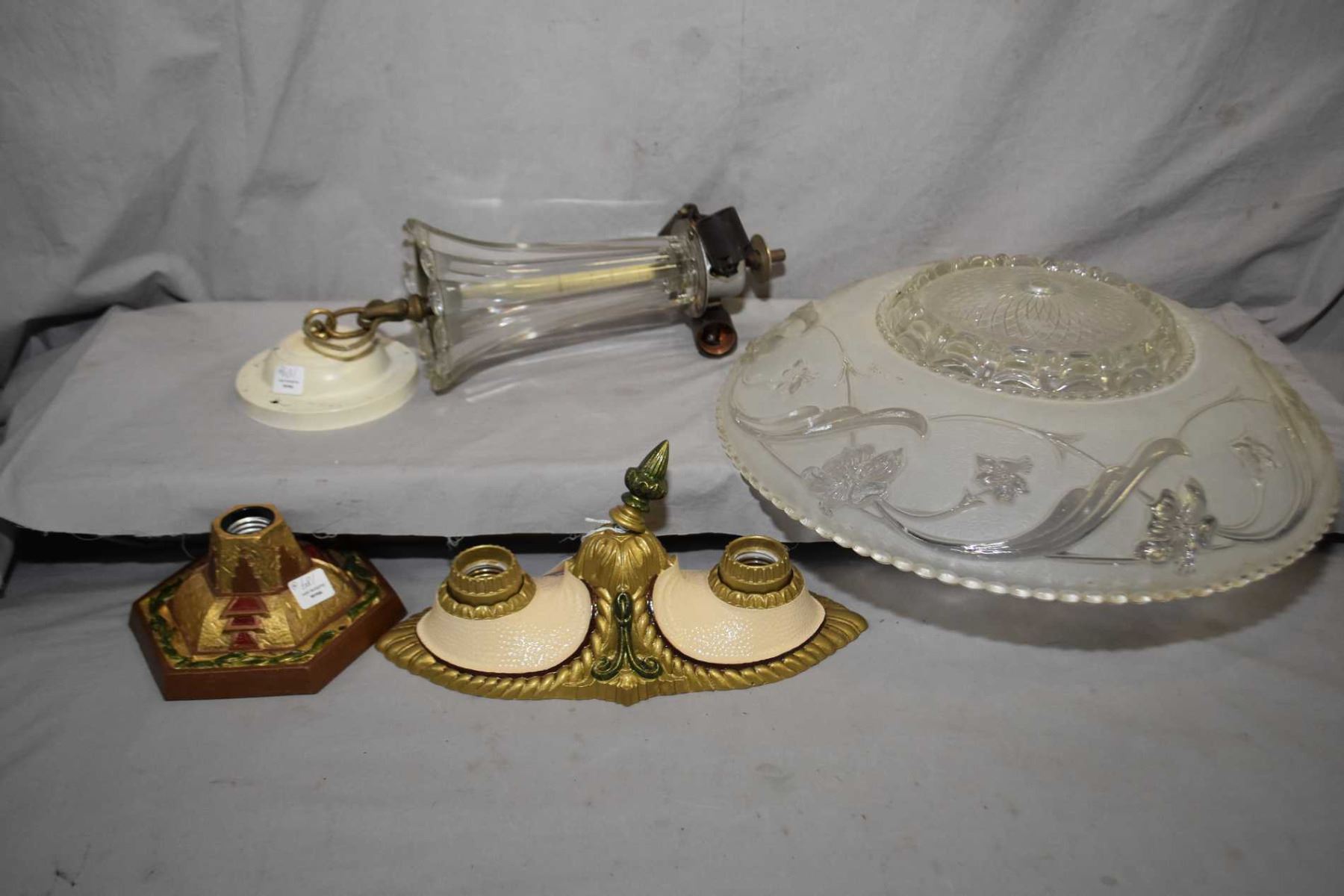 Pair of Art deco light fixtures including single bulb and dual bulb, both rewired and a pressed glas