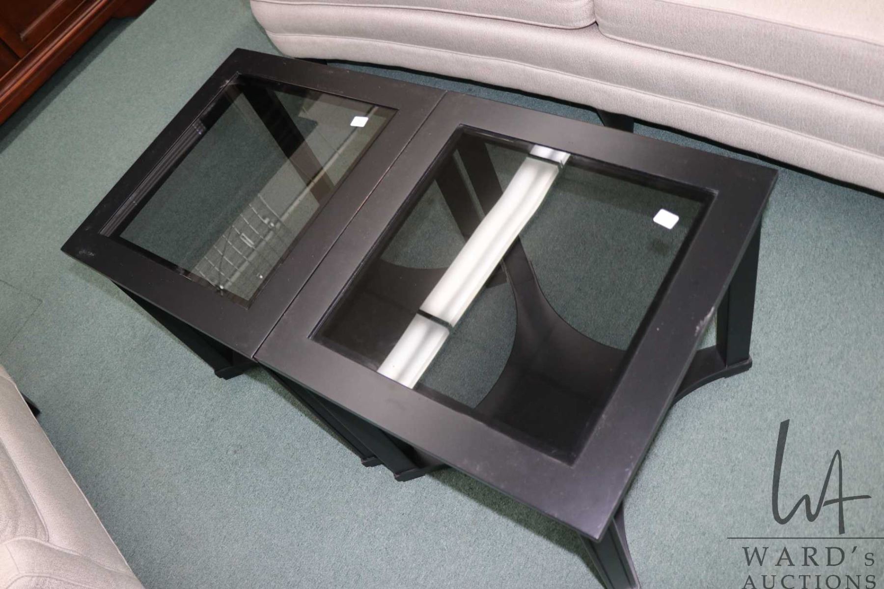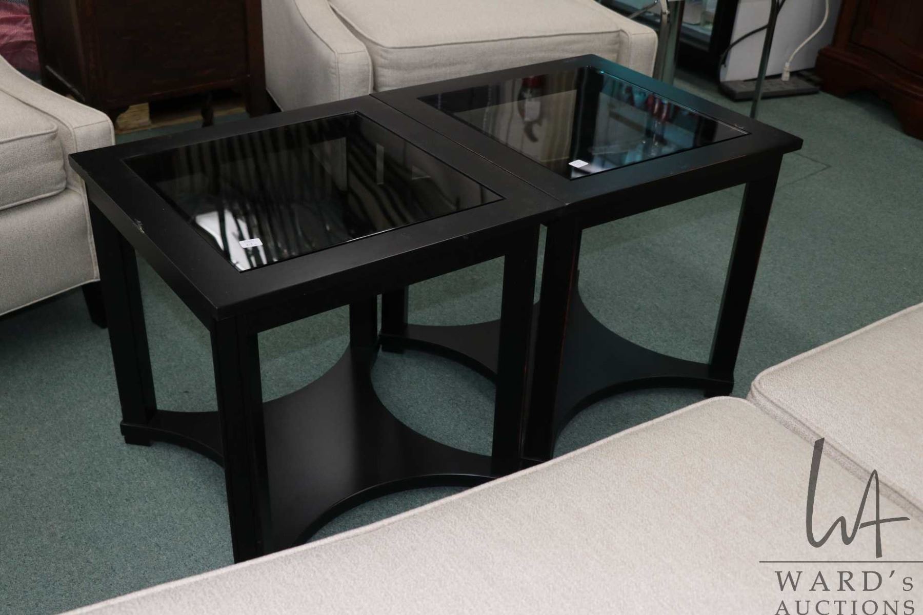 Pair of Canadian made modern wood framed side tables with glass tops, 20" X 20" X 20"