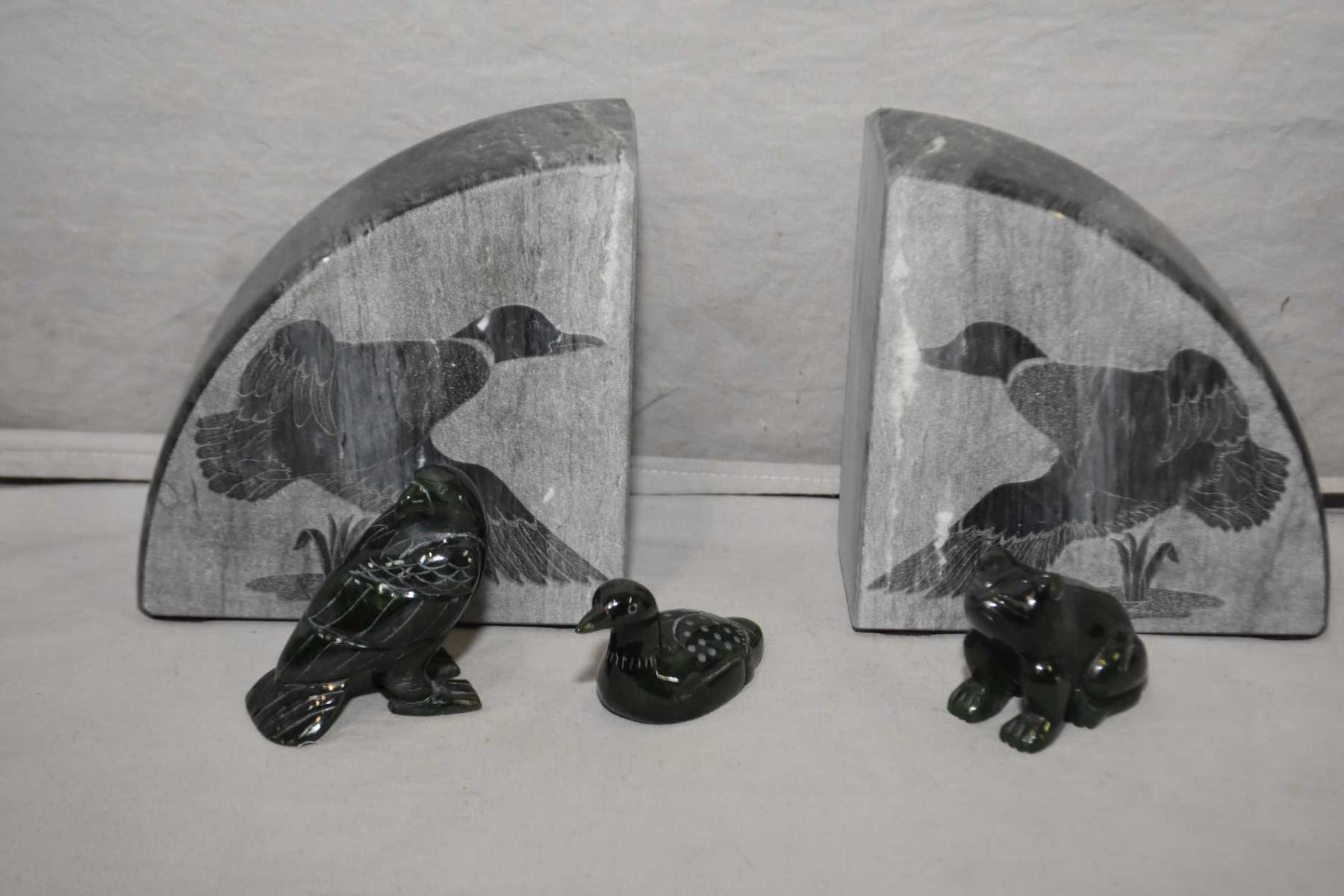 Pair of Canadian soapstone bookend and three jade carvings including two birds and a toad