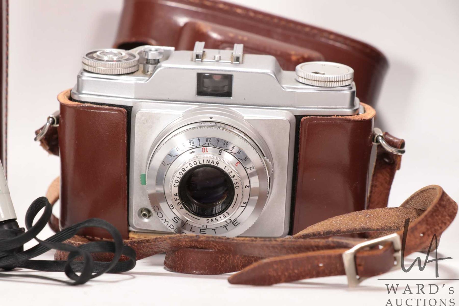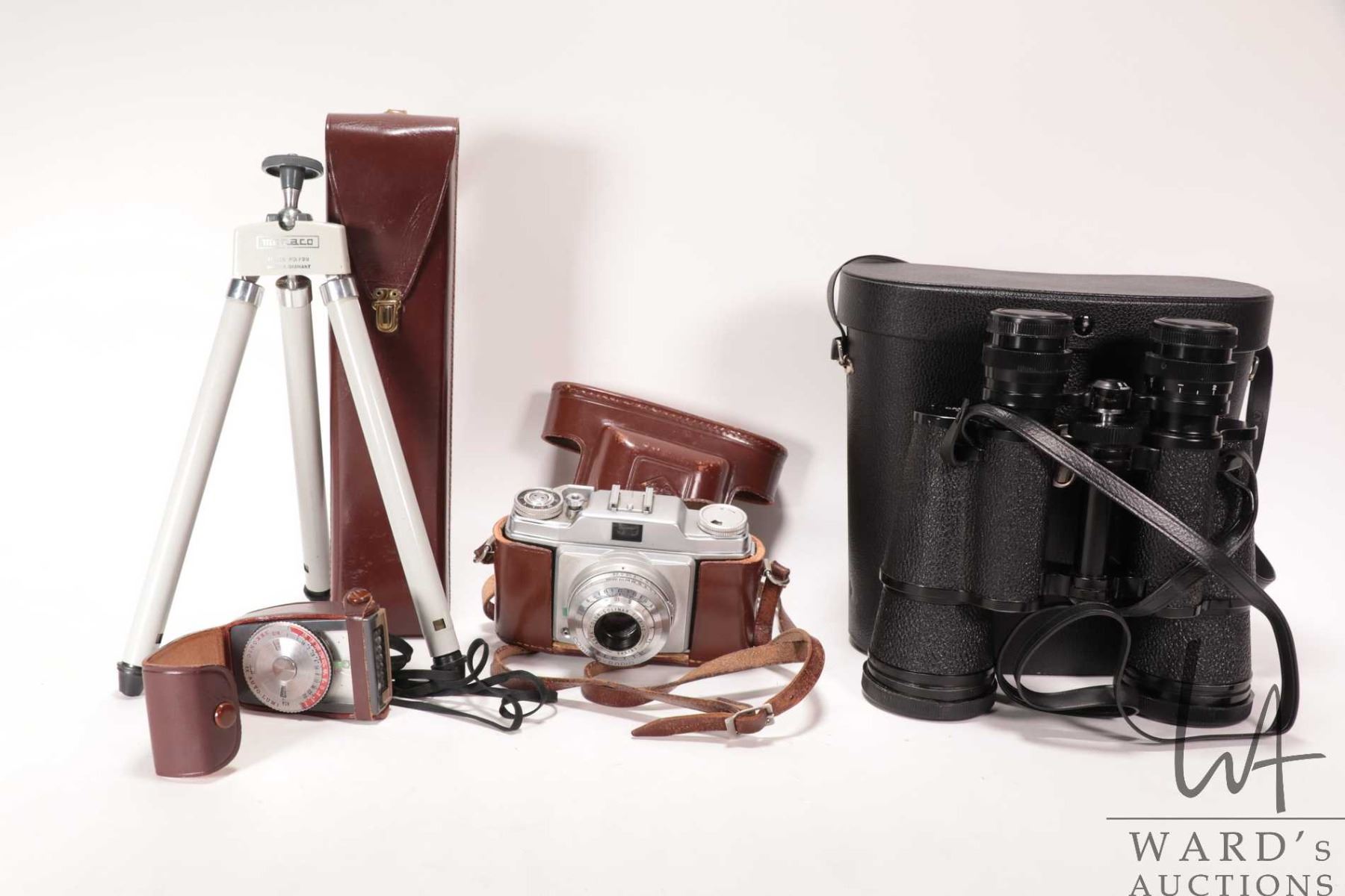 Pair of Carl Hoffer 7 X 50, Field 7.1 degree binocular No. 72222 with case, an Afga Color-Solinar Silette camera with flash and tri-pod, all with leather cases