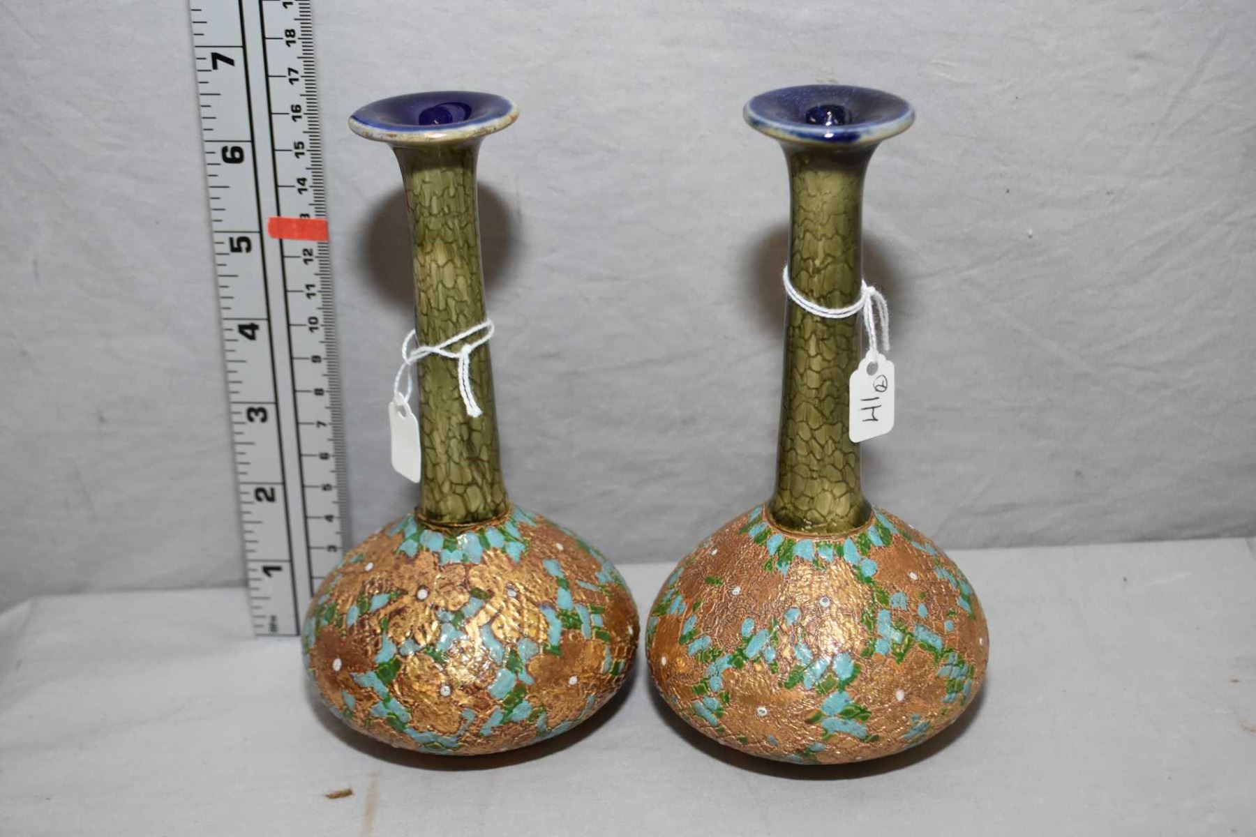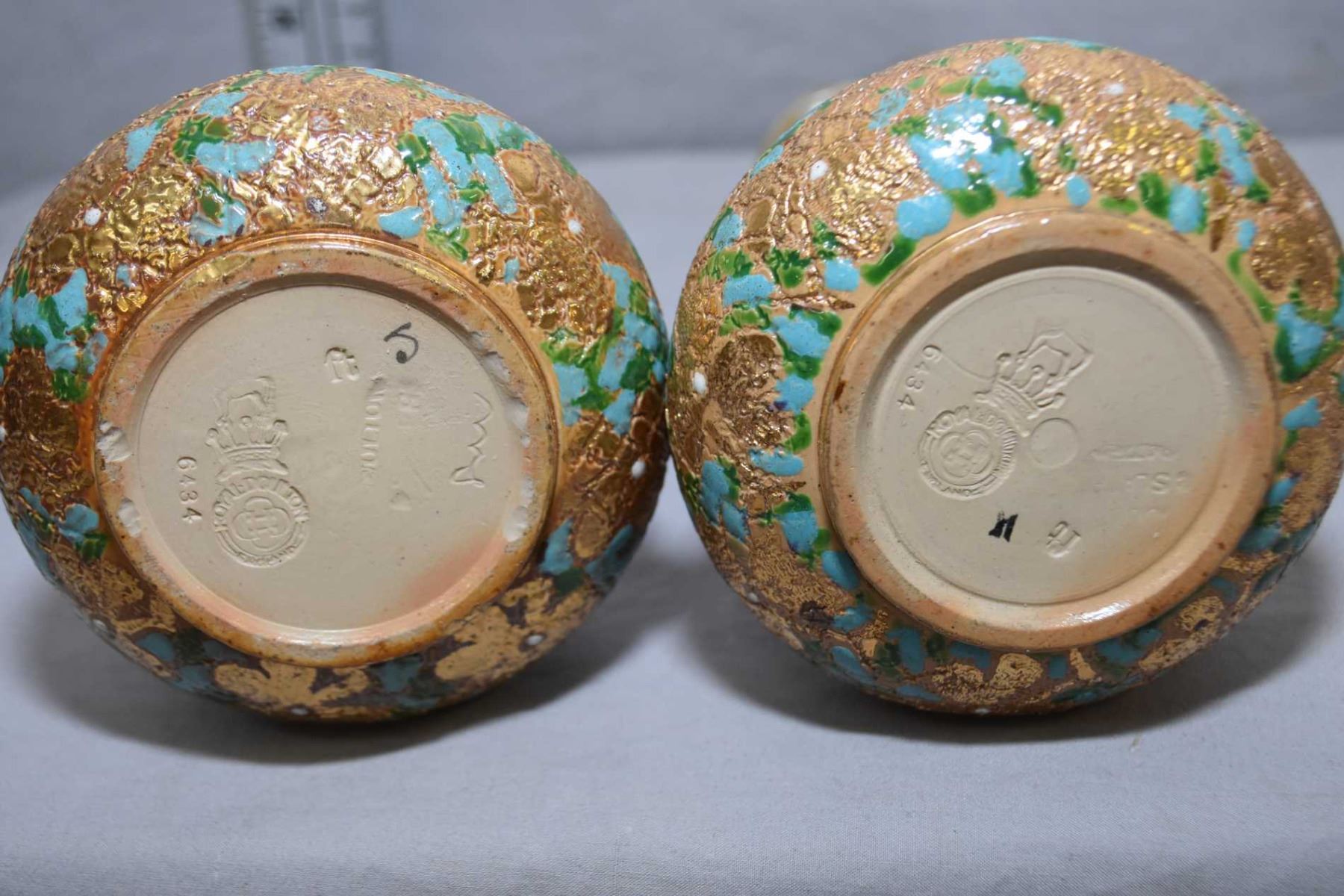 Pair of Royal Doulton glazed stoneware vases marked 6434 and initialled by artist L.M aka Leslie Meredith (?), 7" in height