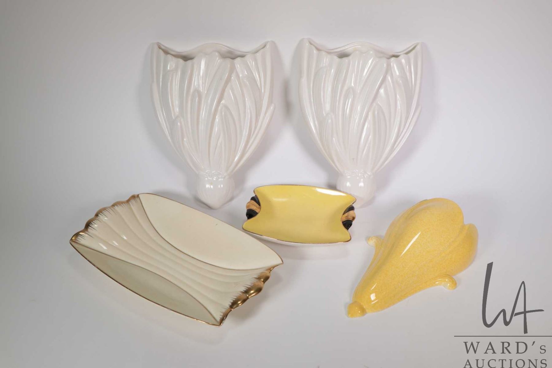 Pair of Sylvac wall pockets, a Royal Winton wall pocket and two Royal Winton trays