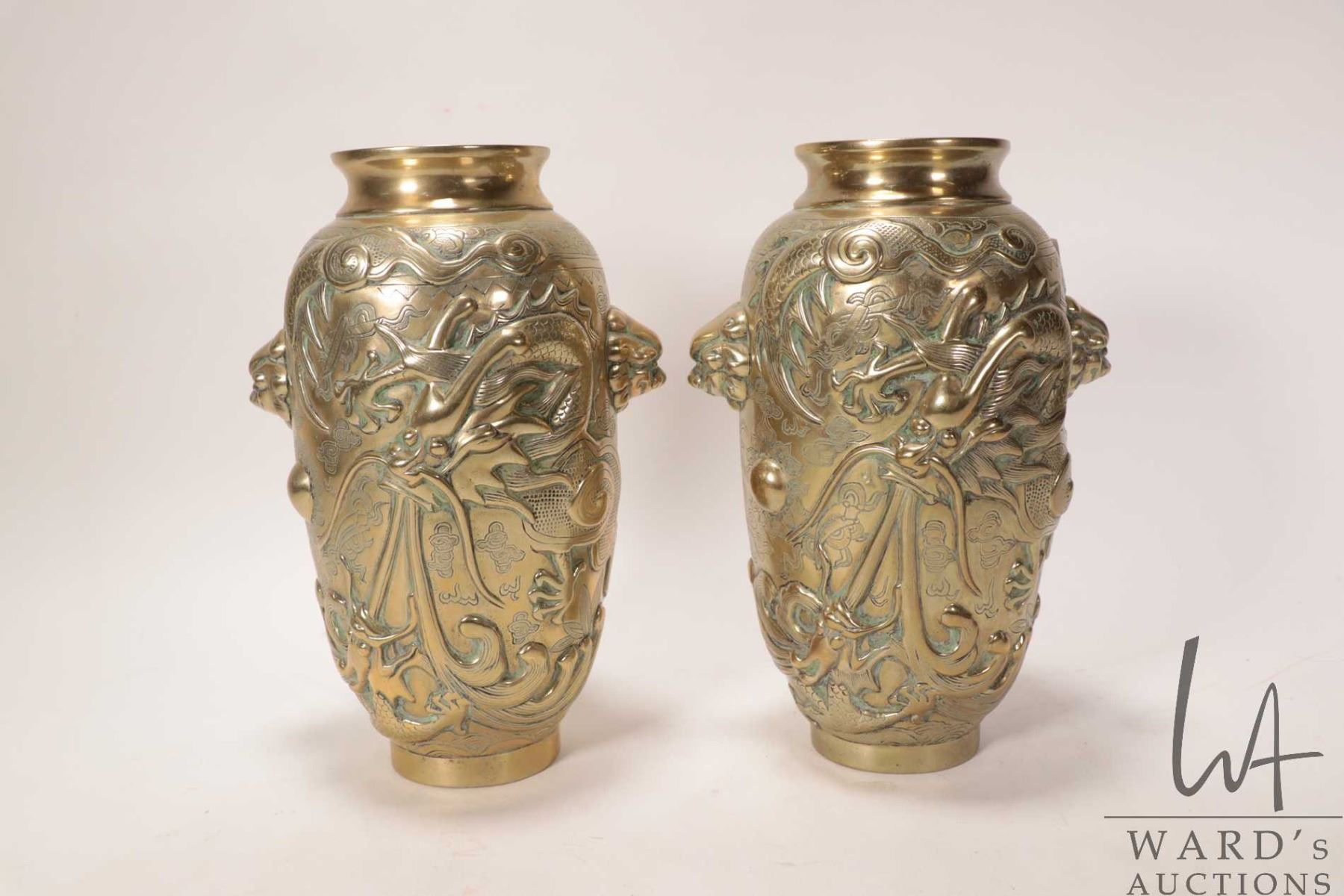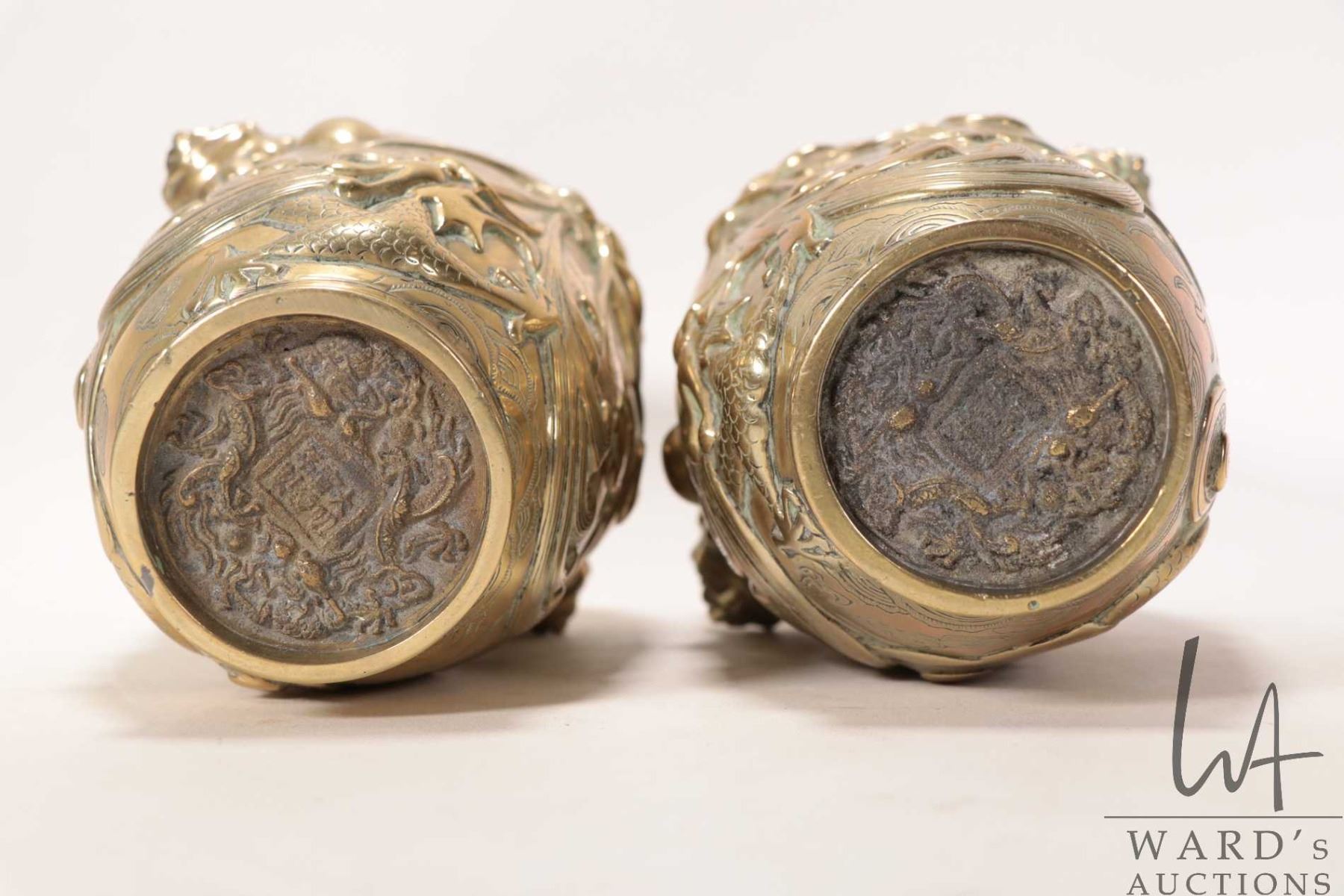 Pair of antique Chinese bronze dragon vases with Taotie mask handles, makers stamp on base, not tran
