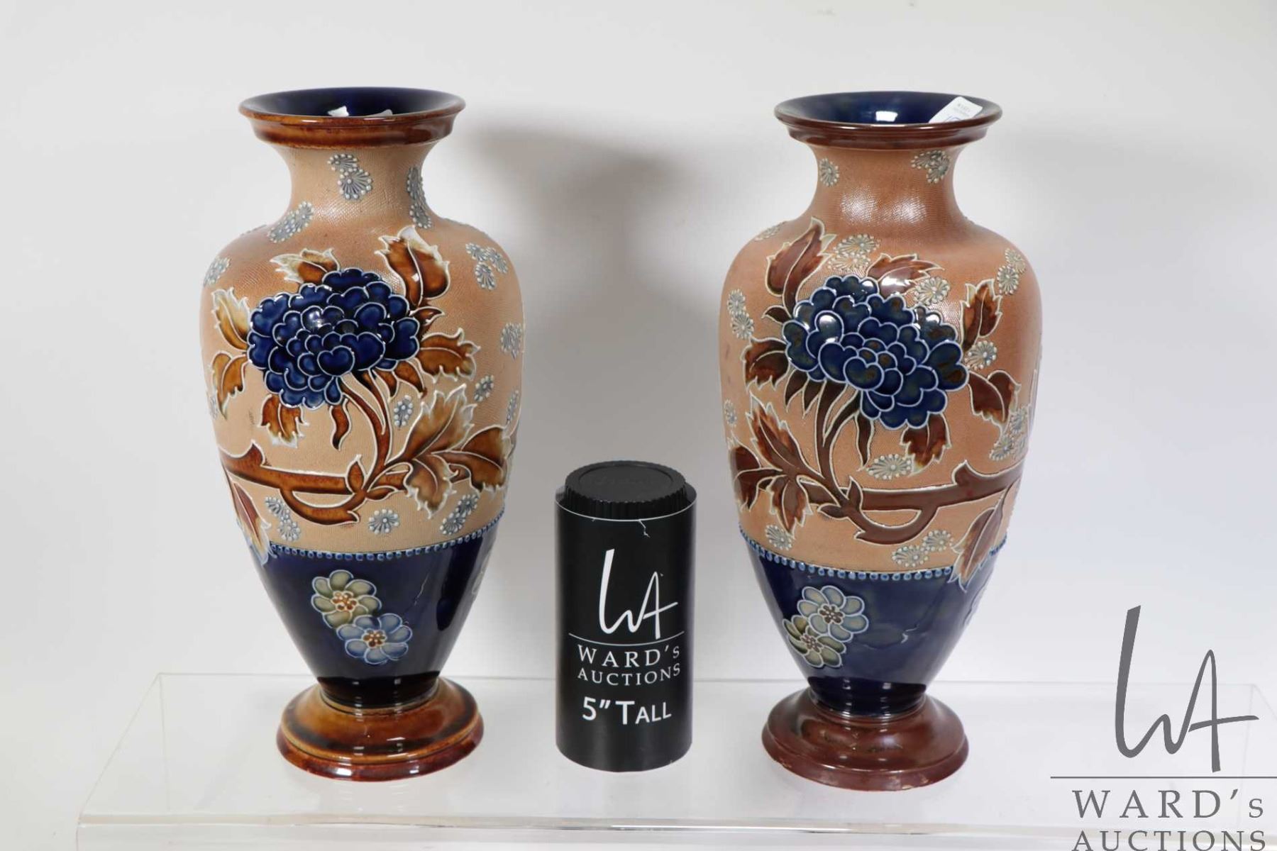 Pair of antique Doulton Lambeth vases circa 1890, both 12" in height, note one has had repair to base, see photos
