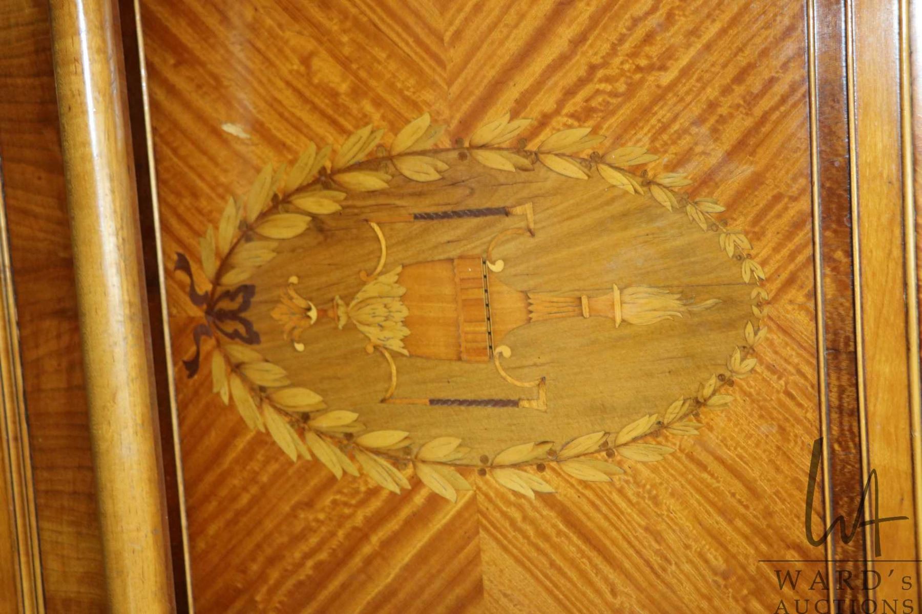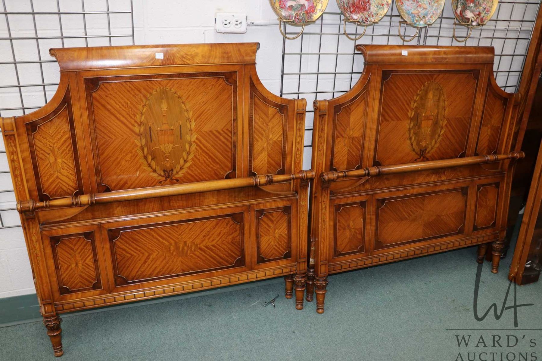 Pair of antique English Regency twin beds with beautifully inlaid decoration and banding, ach approximately 40" wide and includes rails