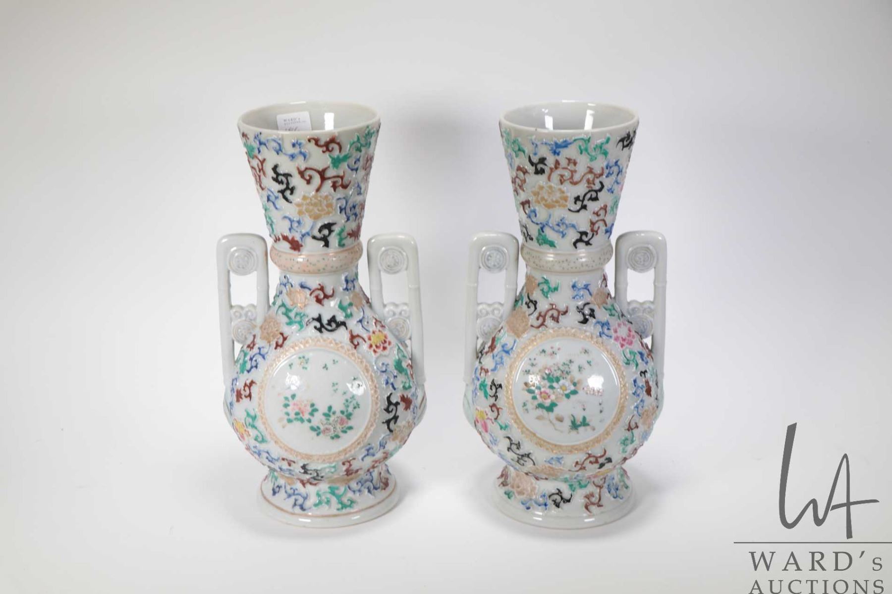 Pair of antique "Moriage" style hand painted vases, each 12" in height