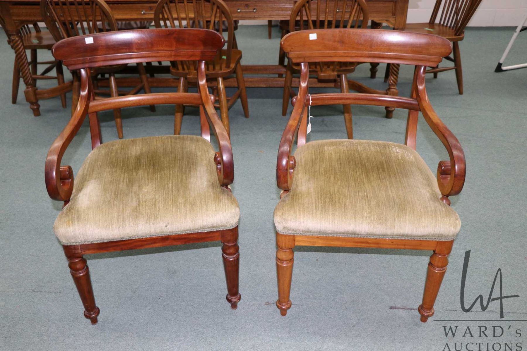 Pair of antique Regency mahogany open arm side chairs with upholstered seats