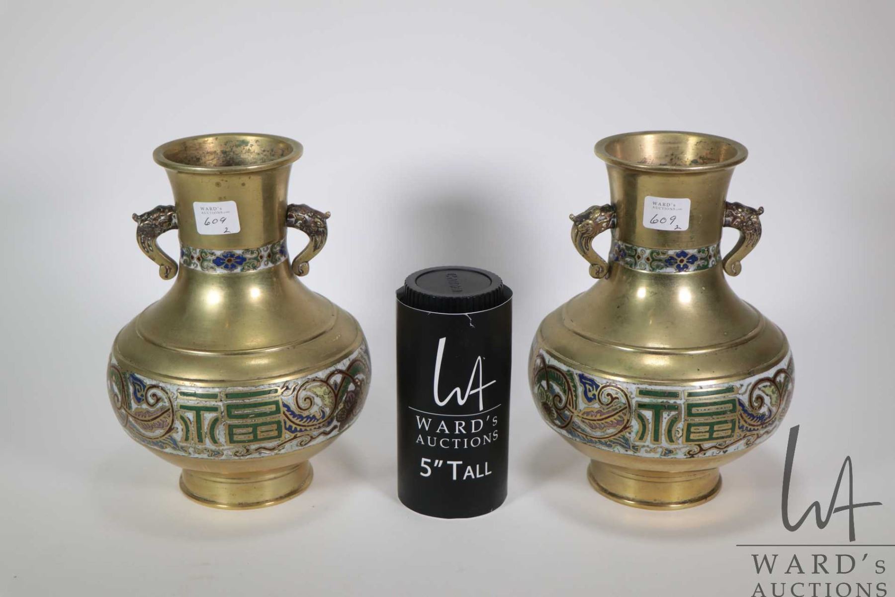 Pair of antique brass champleve double handled vases 8 1/4" in height