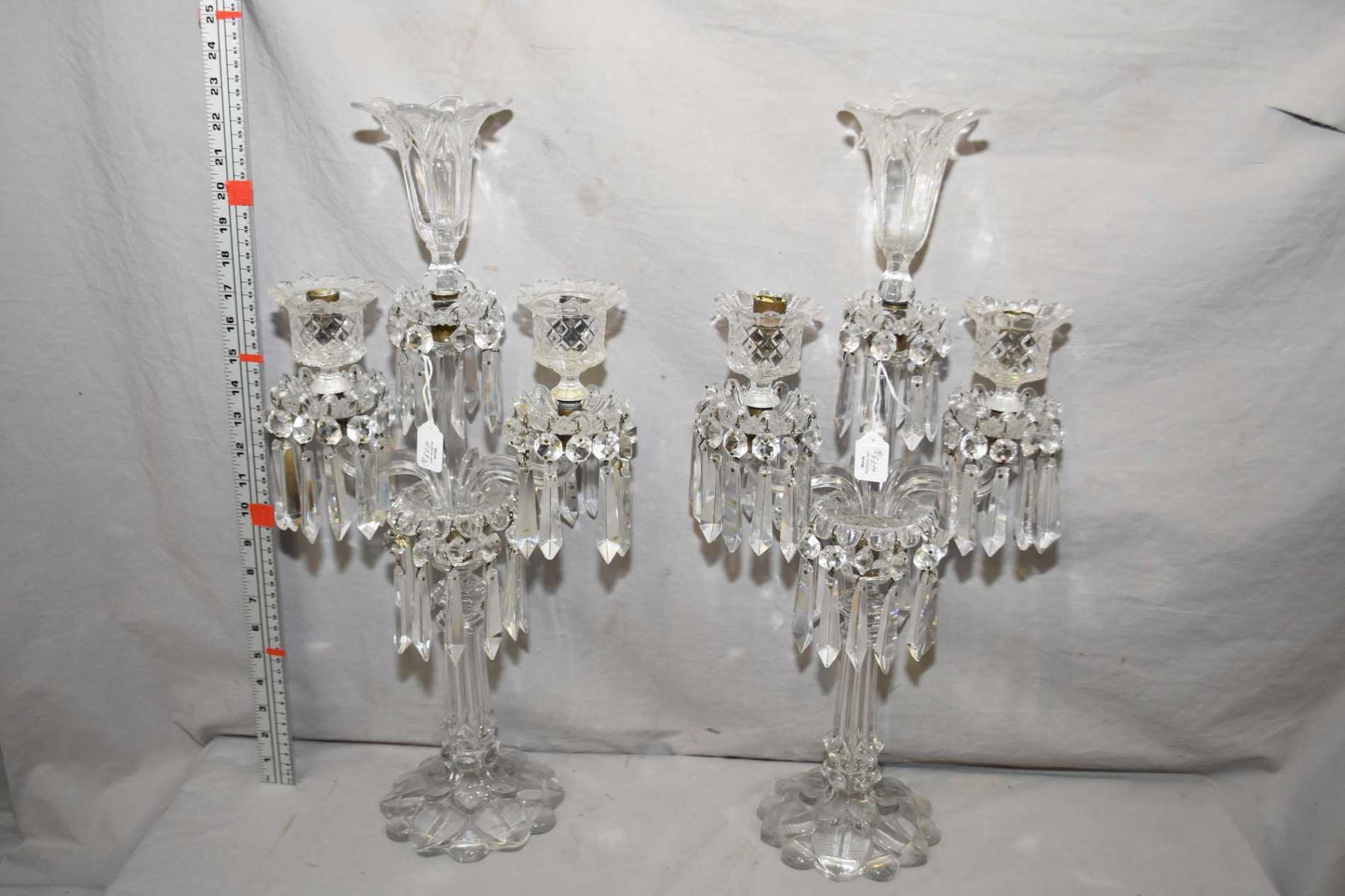 Pair of antique glass convertible two branch candlesticks with poesy holders. 22 3/4" in height