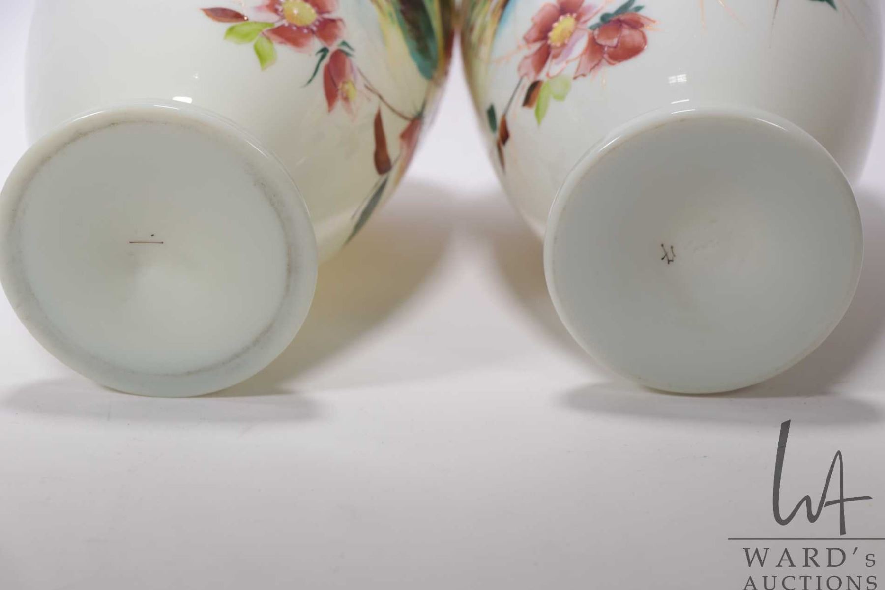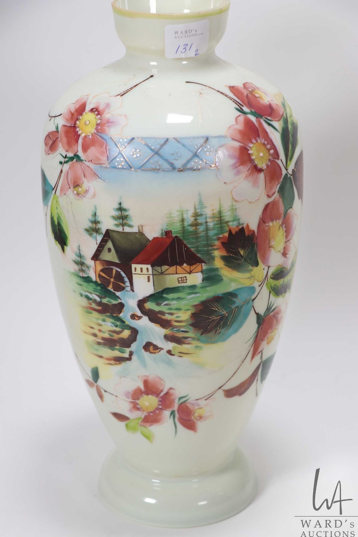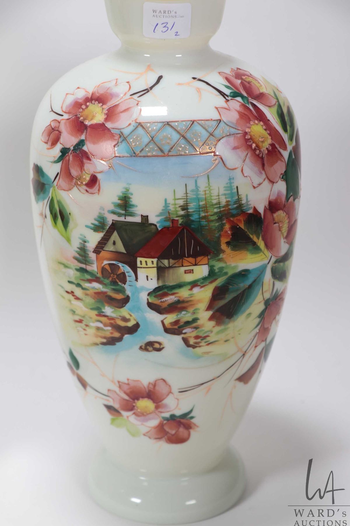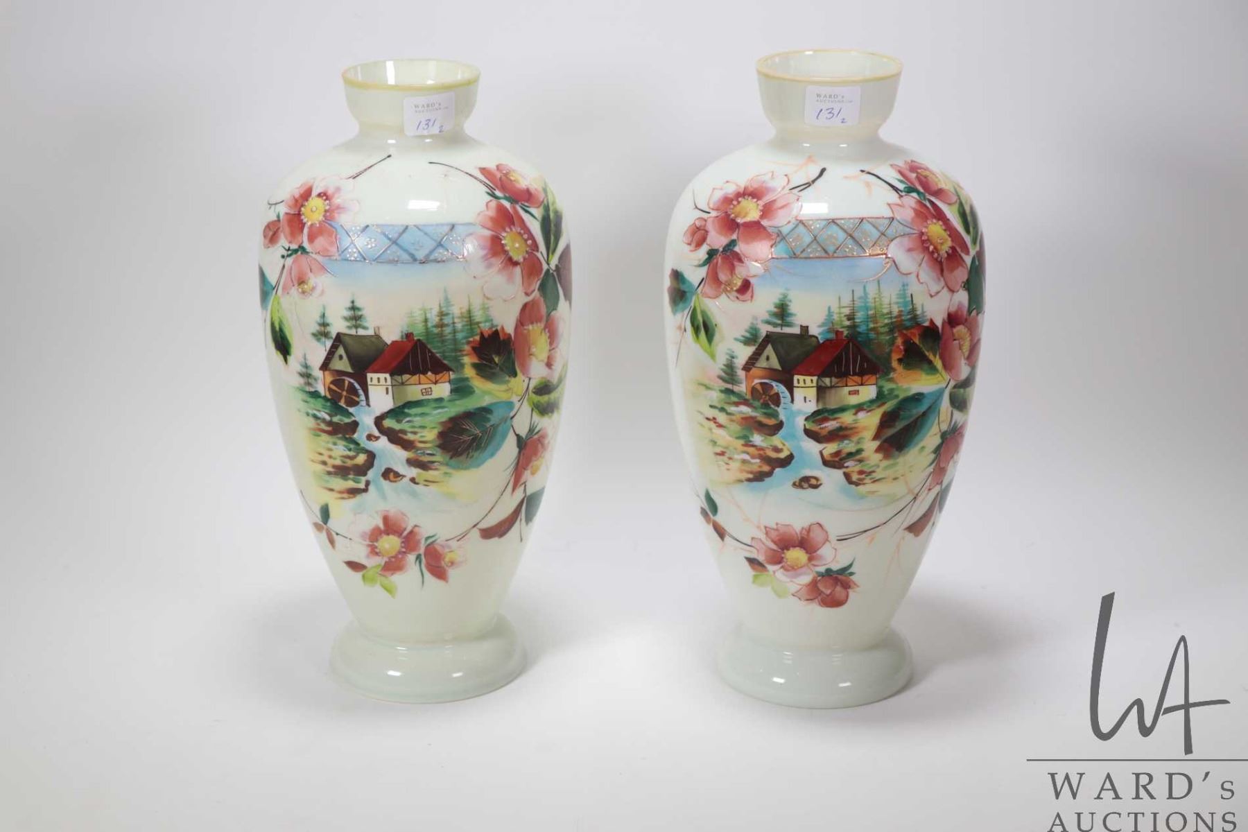 Pair of antique hand painted Bristol glass vases with decorative millhouse and flowers, each 12" in height
