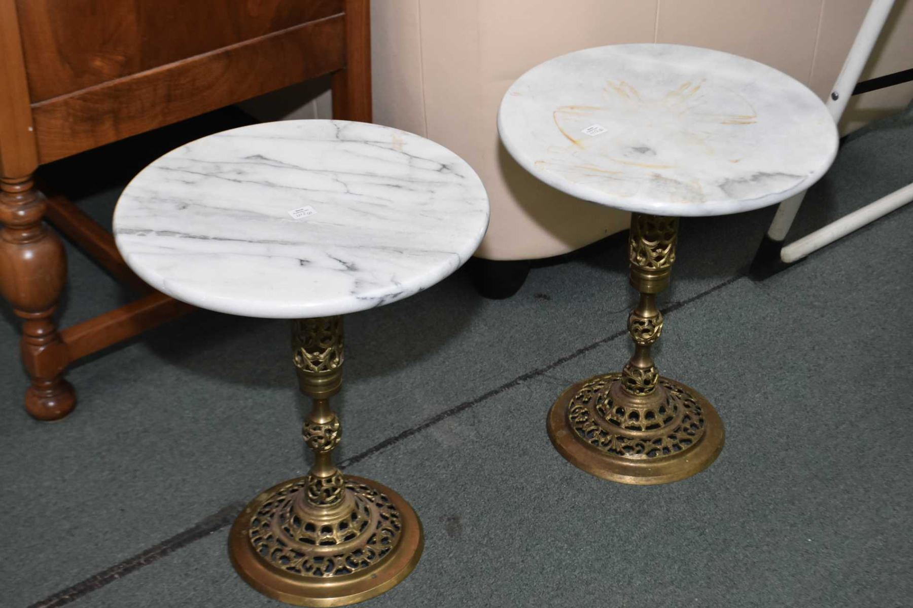 Pair of brass center pedestal marble top wine tables