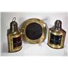 Pair of brass ship's lanterns with original burners and fresnel lenses, one blue and one red, each 12" in height plus a 11 1/2" porthole motif brass wall mirror