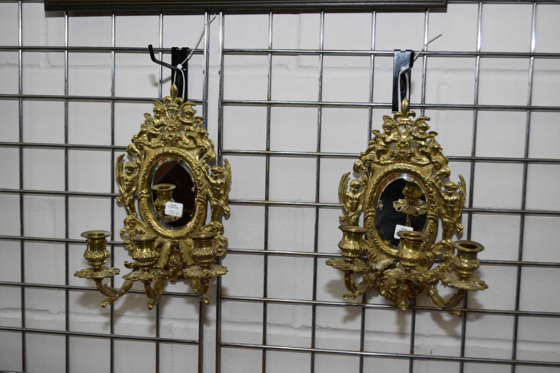 Pair of brass three branch candle sconces set with bevelled mirrors