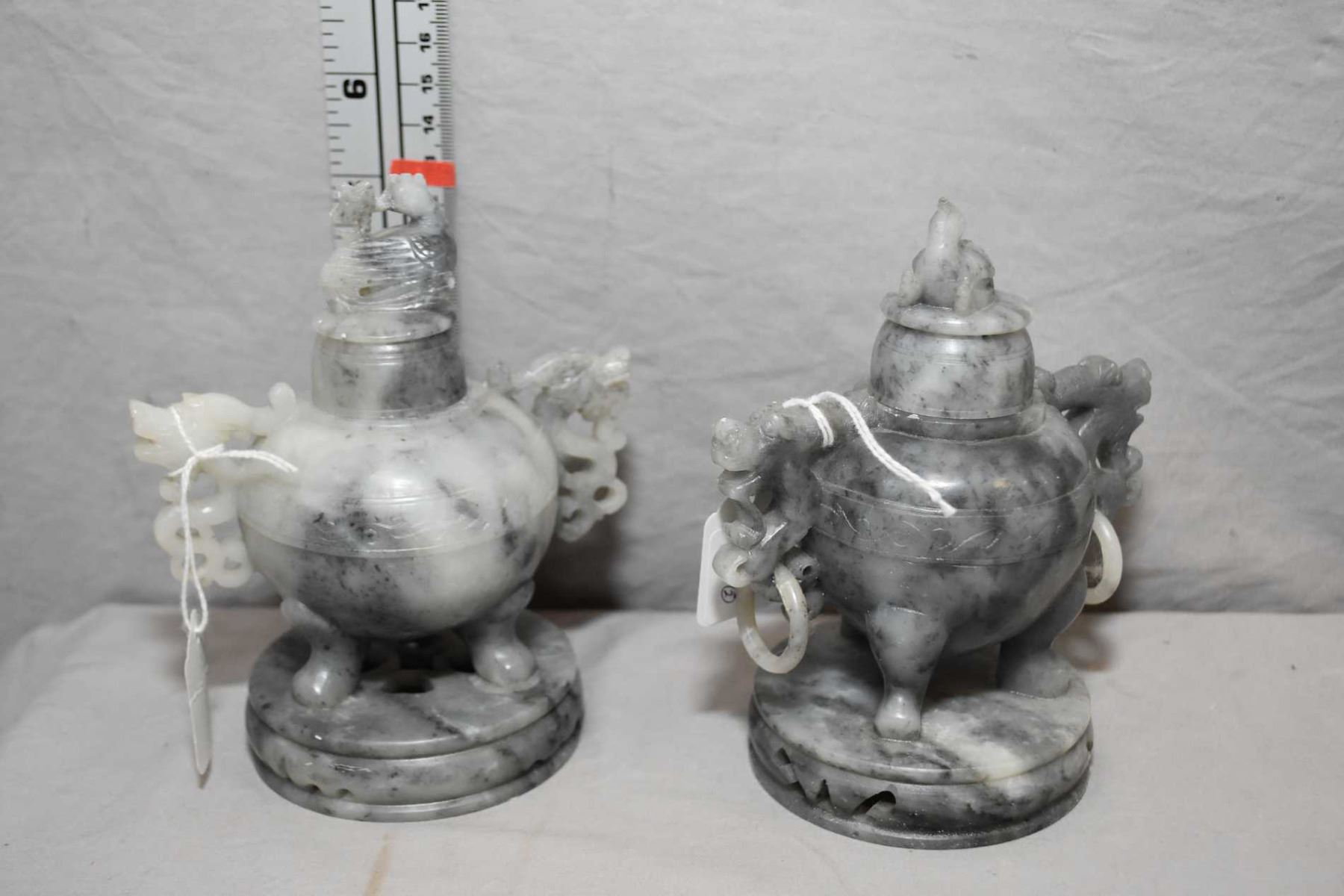 Pair of carved soapstone Foo dog motif double handled pots with Phoenix finial tops, 5 1/2" in height