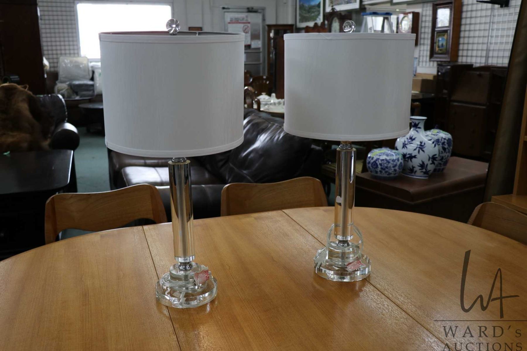 Pair of contemporary glass table lamps with shades and glass finials, 24" in height. Note: Not available for shipping. Local pickup only