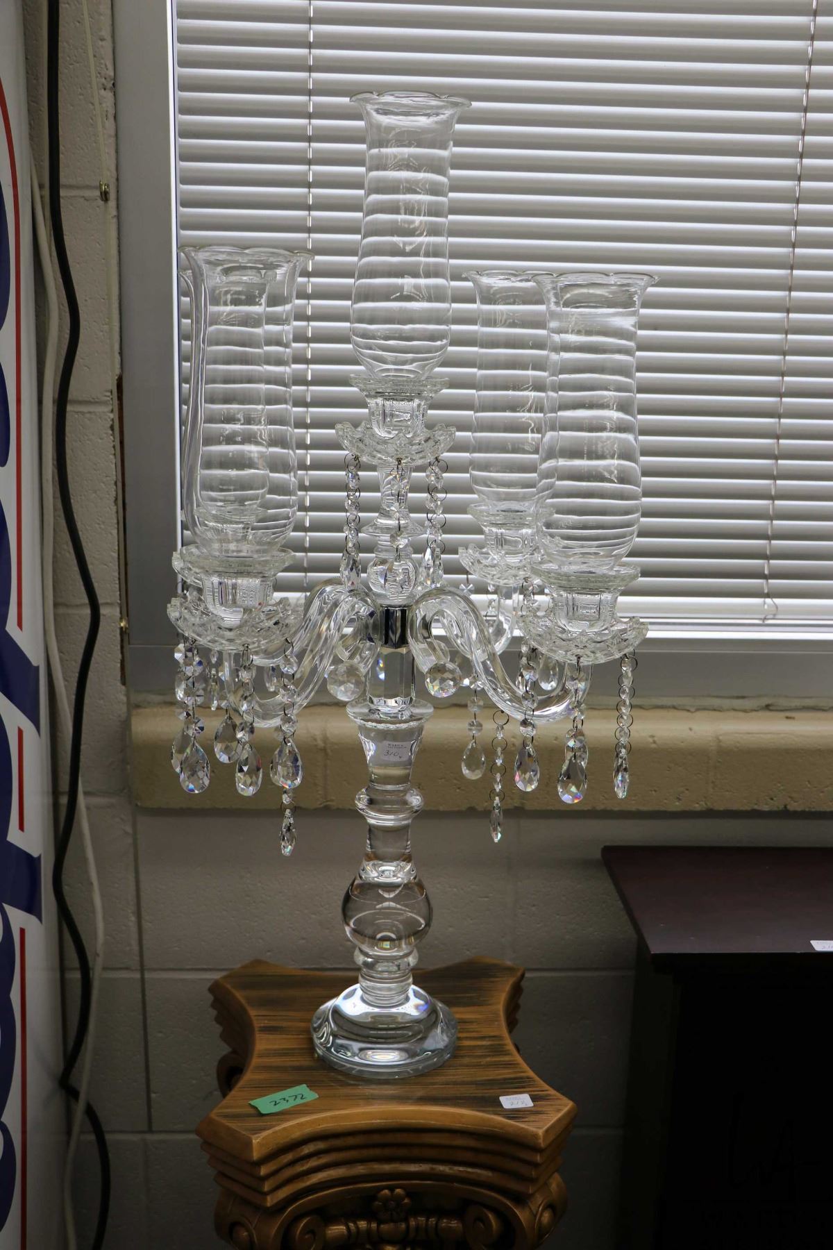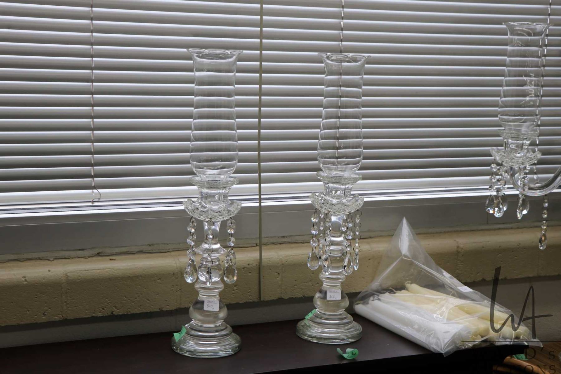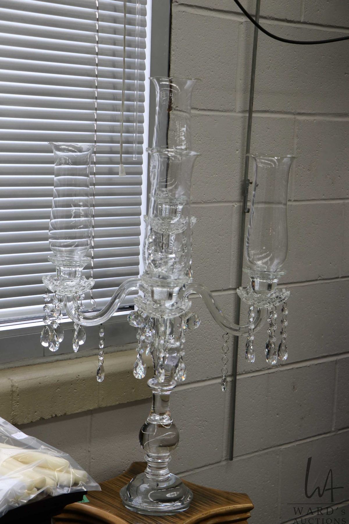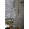 Pair of glass, five branch candelabras with hanging glass lustres 31" in height plus a pair of matching single candle holders, includes candles, 20" in height. Note: Not Available For Shipping. Local Pickup Only