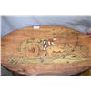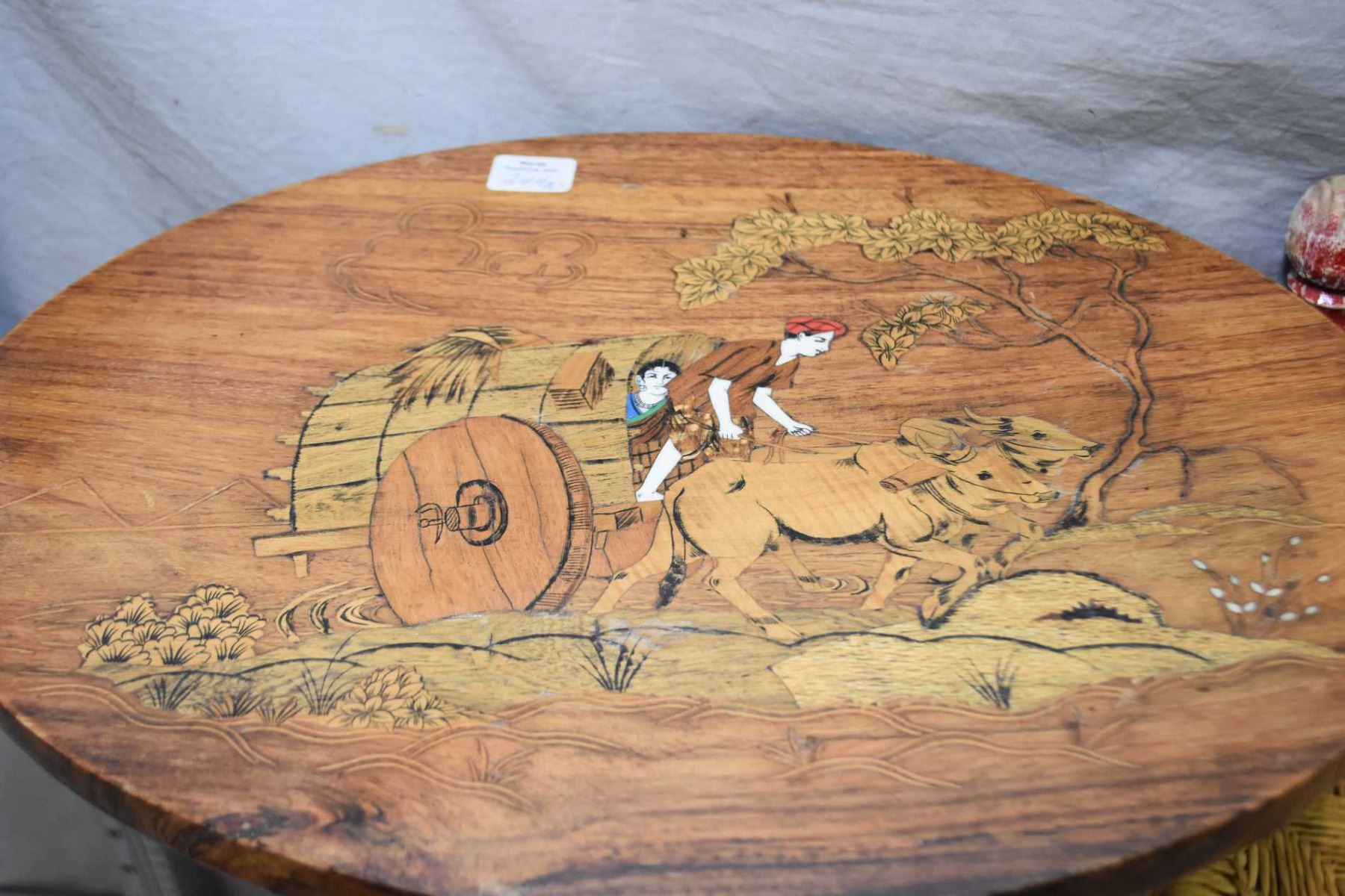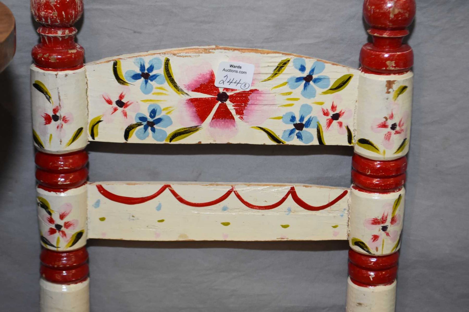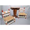 Pair of hand painted children's chairs with woven seats 18" in height and a small flip top table with inlaid pictorial oxen and cart scene, also 18" in height