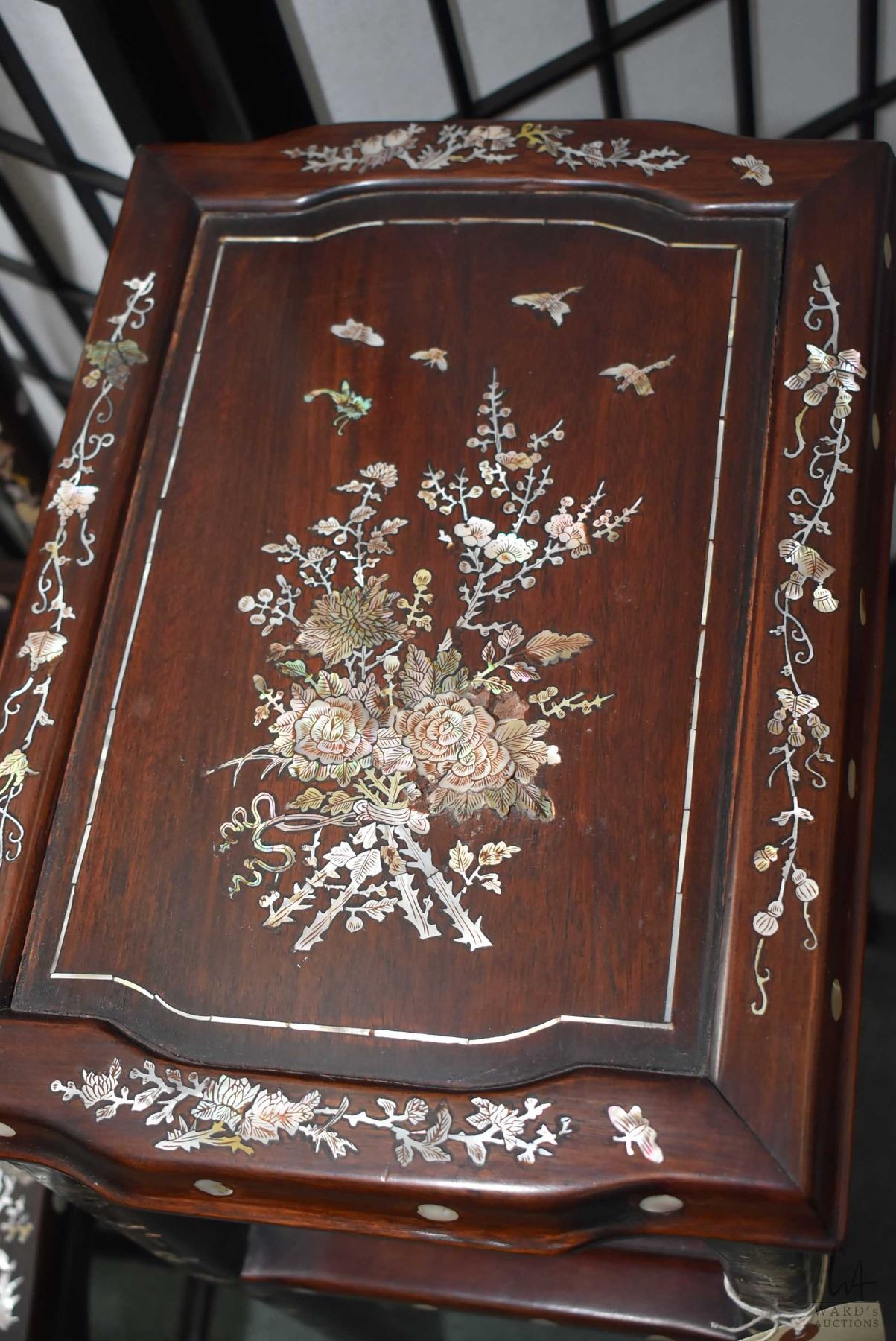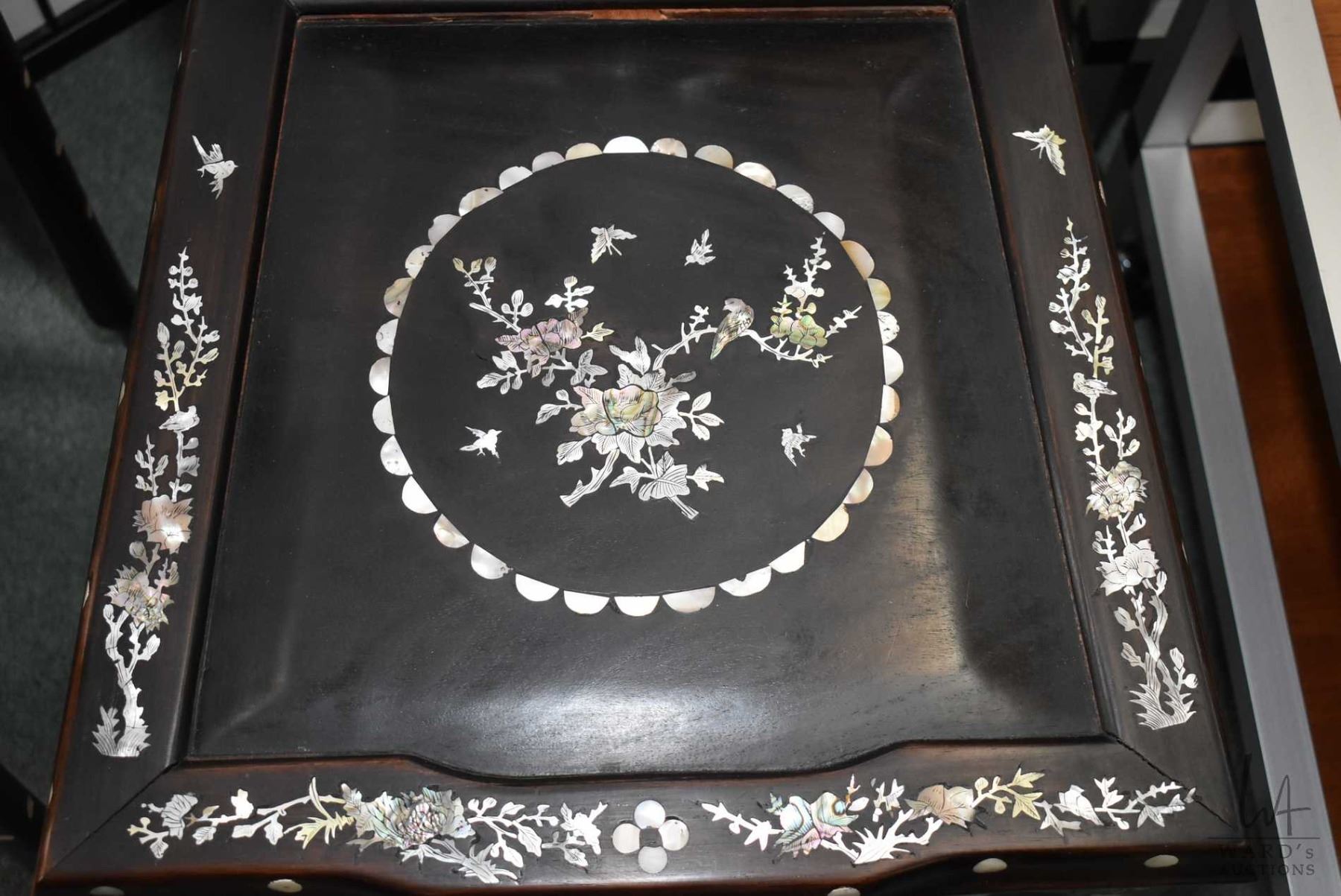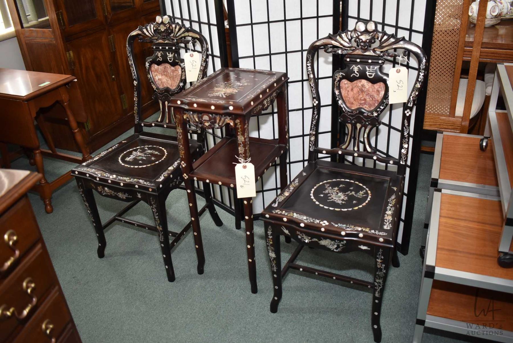 Pair of heavily inlaid rosewood Oriental side chairs plus an inlaid two tier side table